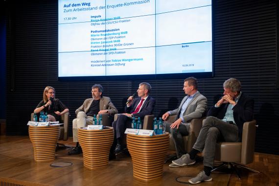 Ronja Kemmer MdB, Obfrau der CDU/CSU-Fraktion in der Enquete-Kommission, drängt in ihrem Impuls auf einer europäischen Wertebasis zu bestehen, aber im Kontext eines globalen Wettbewerbs eine höhere Geschwindigkeit in Deutschland und Europa umzusetzen. Anschließend diskutierte sie gemeinsam mit den anderen Obleuten in der Enquete Mario Brandenburg (FDP), Dieter Janecek (Bündnis 90/Die Grünen) und René Röspel (SPD) den aktuellen Arbeitstand und die Arbeitsweise der Kommission.