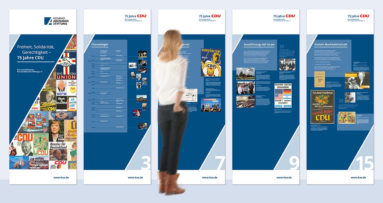Zu verschiedenen historischen Themen und Jubiläen konzipiert die Konrad-Adenauer-Stiftung regelmäßig Wanderausstellungen. In optisch ansprechender Form und didaktisch aufbereitet werden so historische Entwicklungen einem breiten Publikum zur Verfügung gestellt. Die Ausstellungen können entweder zur Ergänzung des Schulunterrichts, aber auch zur Unterstützung von Veranstaltungen genutzt werden. Ihre Einsätze sind vielfältig.