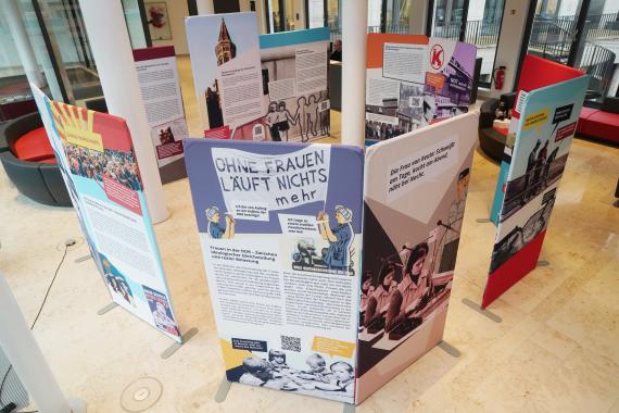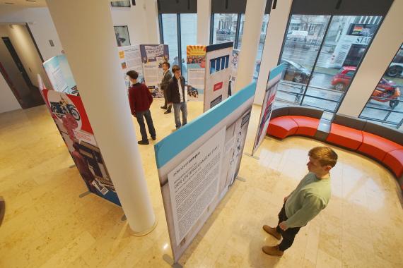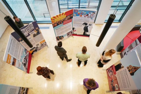 Die Ausstellung besteht aus 11 Modulen, mit einer Breite von 82cm bis 182cm. Die Module haften magnetisch aneinander und können, je nach Begebenheit vor Ort, in verschiedenen Formationen aufgestellt werden. Damit die Ausstellung bei Ihren Schülerinnen und Schüler die beste Wirkung erzielt, ist eine Platzierung in einer Aula oder in einem Foyer empfehlenswert.