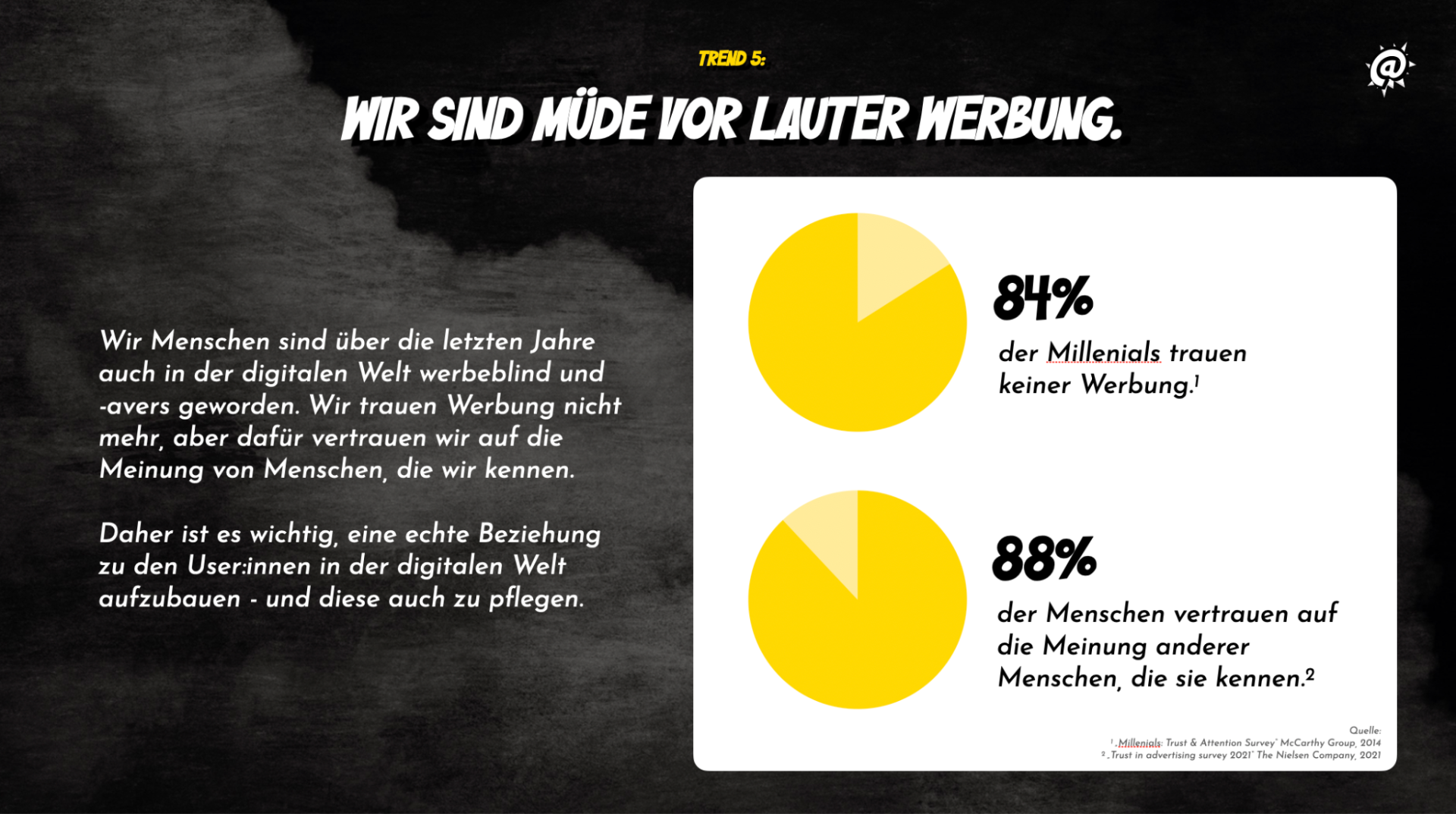 Die Werbeblindheit der User:innen hat dazu geführt, dass User Generated Content (UGC) deutlich besser performt als klassische Werbung auf Social Media. Bei unteren Funnelstufen (wie z.B. Optimierung auf Klicks oder auf Käufe) lieferten UGC-Ads bessere Ergebnisse. Kurz gesagt: Werbung darf nicht wie Werbung wirken - auch wenn klar ist, dass eine werbliche Botschaft enthalten ist. Es geht vielmehr darum, eine Beziehung zur Community aufzubauen, als ständig mit Werbung zu belästigen.