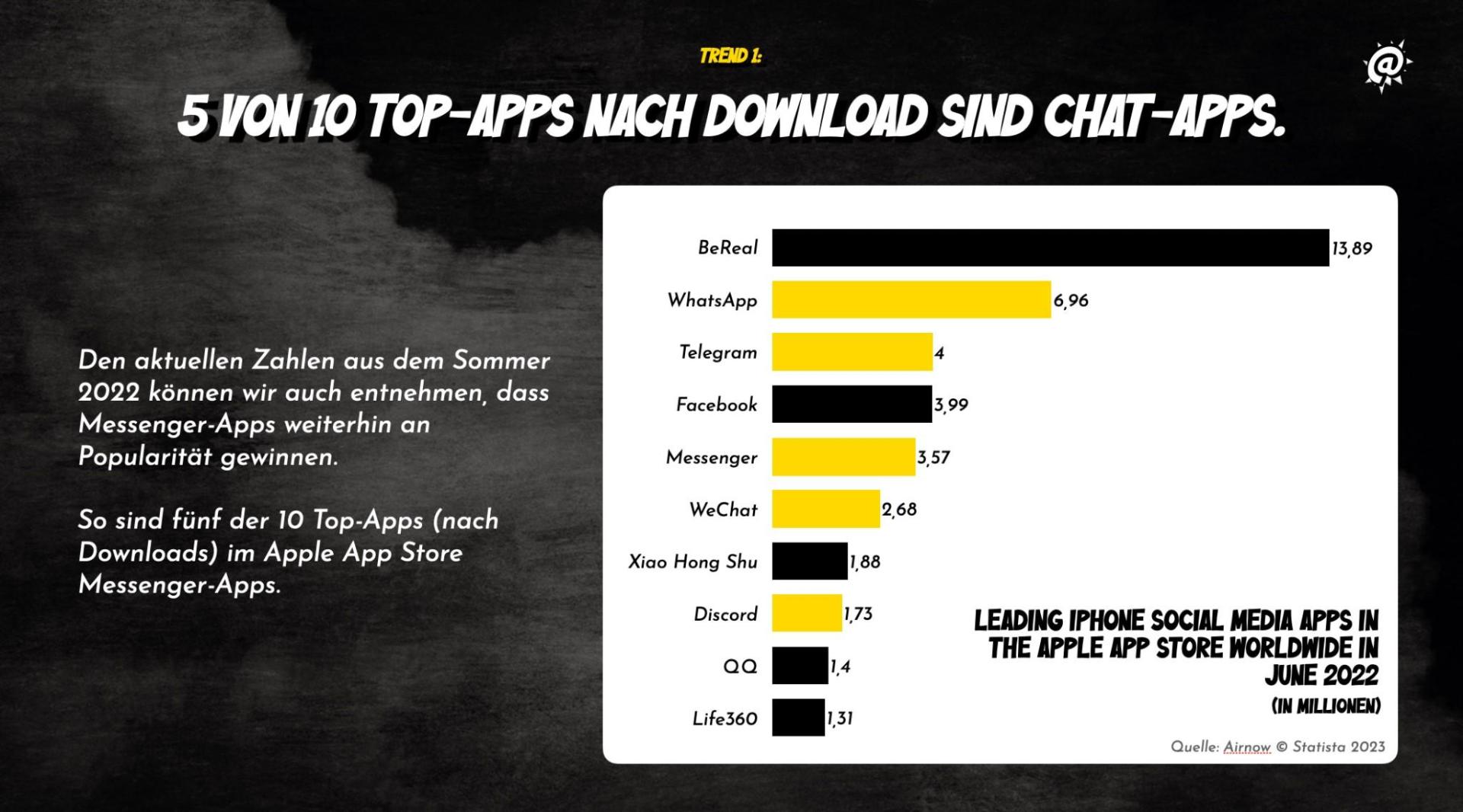 Alleine im Jahr 2022 hat Telegram über 200 Millionen User:innen dazugewonnen. Das ergibt ein prozentuales Wachstum von über 40%. Diesen Trend beobachten wir bereits seit 2015. Seitdem steigt die Anzahl der Social Media User:innen mit Messaging-Fokus stärker als die Anzahl der User:innen anderer Social Media Apps ohne Messaging-Fokus. Insgesamt haben die vier größten Messenger-Plattformen 2023 etwa 4,9 Milliarden aktive User:innen - wobei man Überlappungen durchaus annehmen kann (z.B. User:innen, die WhatsApp und Telegram nutzen). Es gibt eine stärkere Ausprägung des Teilens von Social Media Inhalten über „private Wege“ wie zum Beispiel über Textnachrichten. Meta hat bereits letztes Jahr angekündigt, neue Werbeformate einzuführen wie etwa Click-to-Messaging Ads (Direkte Weiterleitung zu FB Messenger, IG Messages oder WhatsApp). Auch Instagram hat vor Kurzem ein neues Update veröffentlicht: Broadcast Channels. Generell merken Social Media User:innen vermehrt, dass Updates insbesondere den Messaging-Bereich betreffen.