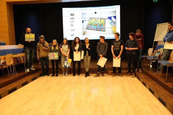 Unter Anleitung eines Künstlers sollten die Jugendlichen Bilder und Botschaften auf Papier sprayen, die dann an den Wänden der Akademie ausgestellt wurden.