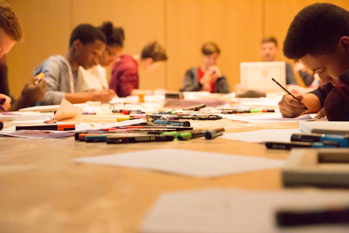Unter Anleitung eines Künstlers sollten die Jugendlichen Bilder und Botschaften auf Papier sprayen, die dann an den Wänden der Akademie ausgestellt wurden.