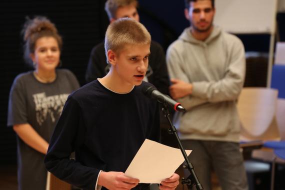 Die jungen Erwachsenen sollten unter Anleitung eines Slampoeten eigene Texte schreiben und sie dann in Form eines Dichterwettstreits vortragen. In den Gedichten und Wortbeiträgen sollten die eigenen Gedanken und Empfindungen wiedergegeben werden.%%%''Workshopleiter: Bas Böttcher, Slampoet''