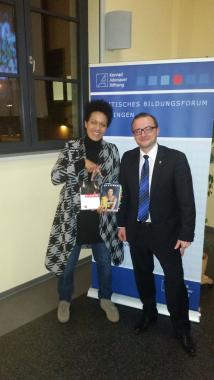 Zum diesjährigen DenkTag war die bekannte TV-Journalistin Mo Asumang zu Gast, welche ihr Buch „MO UND DIE ARIER: ALLEIN UNTER RASSISTEN UND NEONAZIS“ vorstellte. Mo Asumang wurde in Kassel als Tochter einer Deutschen und eines Ghanaers geboren und musste bereits früh Erfahrungen mit Rassismus und Ausgrenzung aufgrund ihres Aussehens als „Afrodeutsche“ machen. Die Veranstaltung fand in Kooperation mit der Greizer Stadt- und Kreisbibliothek statt, deren Leiterin Corina Gutmann die Gäste ebenfalls begrüßte.