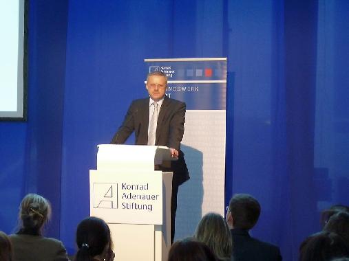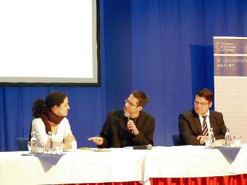 Kontrovers und vielseitig debattierten rund 75 Schüler von vier Erfurter Gymnasien unter der Schirmherrschaft von Thüringens Ministerpräsidentin Christine Lieberknecht (CDU) mit Vertretern aus Bundes- und Landespolitik, Wirtschaft und Umweltschutzverbänden über Themen wie erneuerbare Energien und Elektromobilität. Erstmals hatte das Bildungswerk der Konrad-Adenauer-Stiftung (KAS) Erfurt den Jugendpolitik organisiert, der in Zukunft zu einer festen Institutionen werden soll. Staatssekretär Roland Richwien aus dem Thüringer Minsterium für Landwirtschaft, Forsten, Umwelt und Naturschutz überbrachte die Grüsse der Ministerpräsidentin und führte ins Thema ein.