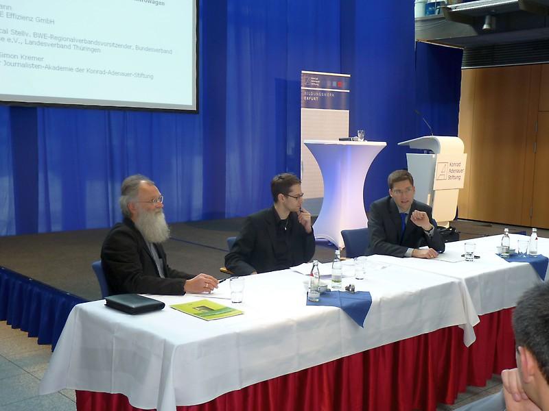Dass jeder einzelne etwas für den Umweltschutz tun kann betonte auch Stephan Hloucal, thüringischer Landesvorsitzender des Bundesverbandes für Windenergie im Forum „Nachhaltige Technologien: Wind, Sonne und Elektrowagen“. Er fährt selbst ein Auto mit Bioöl-Antrieb und unterstrich den künftigen Wandel, dem das Thema Fortbewegung unterliegt: „Mobilität wird neu definiert werden.“ Es werde wieder kleinräumige Wirtschaftskreisläufe geben, mit kurzen Wegen und Obst vom Bauern aus der Region, weil die Transportkosten zu hoch werden. Christian Hirte ergänzte aus seiner Arbeit im Bundestagssausschuss, in welchem er Berichterstatter zur Elektromobilität ist. Simon Kremer, Absolvent dr Journalisten-Akademie dr Konrad-Adenauer-Stiftung moderierte das Forum.