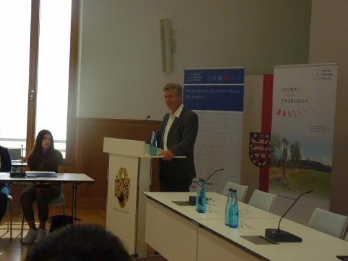 Nach der Begrüßung der Anwesenden durch Daniel Braun, wissenschaftlicher Mitarbeiter der Konrad-Adenauer-Stiftung Thüringen, übernahm Oberbürgermeister Dr. Klaus Zeh das Wort. Es sprach über die Bedeutung der Demokratie und über das Aufgabenspektrum eines Kommunalpolitikers. In diesem Zusammenhang betonte er die Wichtigkeit der bürgerlichen Partizipation und erwähnte als Beispiel für eine Möglichkeit, sich an der Politik zu beteiligen, den in Planung stehenden Jugendstadtrat für Nordhausen, für den es interessierte und engagierte „Abgeordnete“ zu finden gilt.