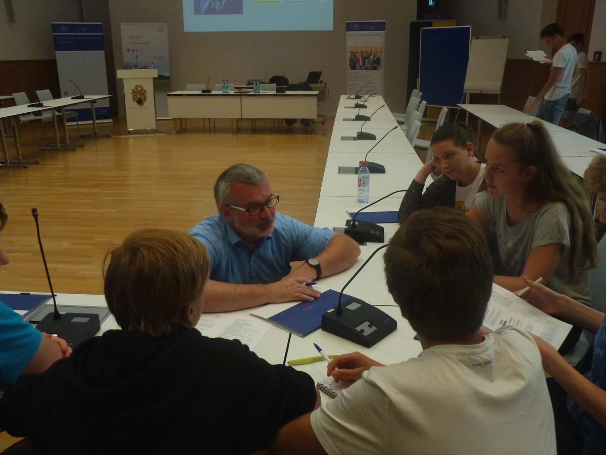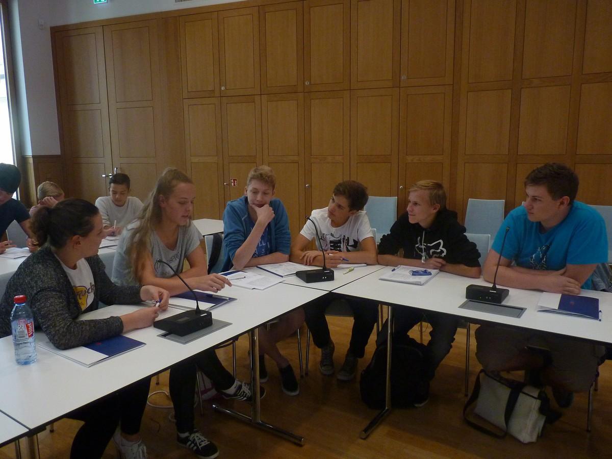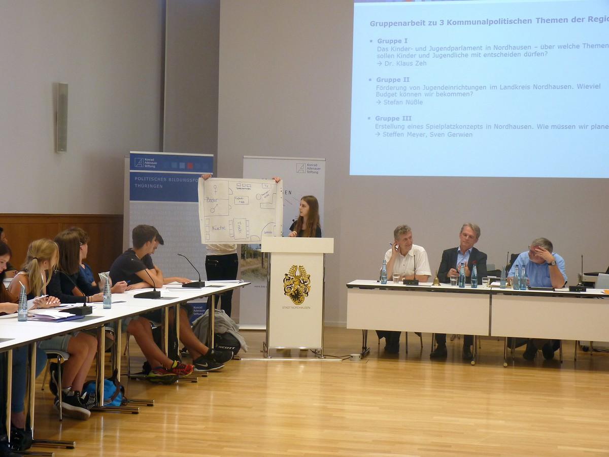 Im Anschluss an die Ausführungen der Referenten fanden sich die Jugendlichen in drei großen Gruppen zusammen, die je ein kommunalpolitisches Thema behandeln und am Ende einen Antrag einreichen sollten. Die Themen waren: a) Das Kinder- und Jugendparlament in Nordhausen – über welche Themen sollen Kinder und Jugendliche mit entscheiden dürfen?, b) Förderung von Jugendeinrichtungen im Landkreis Nordhausen. Wieviel Budget können wir bekommen? und c) Erstellung eines Spielplatzkonzepts in Nordhausen. Wie müssen wir planen? Innerhalb der drei Gruppen fand nochmals eine Zerspaltung in die verschiedenen aktuell existierenden Fraktionen statt, sodass sich zur fiktiven Stadtratssitzung unter der Leitung von Dr. Zeh, Herrn Hein und Herrn Nüßle, vier Fraktionen (SPD, Linke, CDU/CSU, Grüne) zusammenfanden, um über ihre Vorschläge abzustimmen.