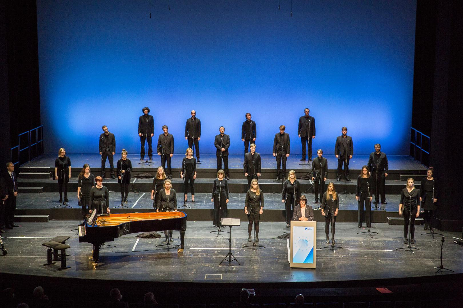 Und dann verstummten die Worte; die Pianisten und der Junge Kammerchor Köln traten auf die Bühne, Musik und gedichteter Text übernahm die Regie, streute Andeutungen von dem, was sein könnte, aus. „Für Europa lasst uns streiten…, um den Fortschritt zu begleiten, der noch nicht begriffen hat, was wir können, was wir wollen.“ Europa ist da, aber es ist noch nicht selbst-bewusst genug, „denn es gibt noch die Dämonen, die in manchen Köpfen sind“. Das ganze hatte etwas Weihevolles, das einen größeren Zusammenhang erahnen ließ. Die Oper bot den feierlichen Rahmen dazu, zu viel Licht hätte der Erkenntnis geschadet. Die Bonnerinnen und Bonner können sagen, sie seien dabei gewesen. Ihr Applaus verriet, dass ihnen das sofort bewusst war.