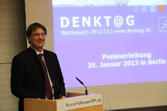 Der Leiter der Akademie der KAS und Organisator des Wettbewerbes, Andreas Kleine-Kraneburg, bedankte sich bei allen Teilnehmern für die insgesamt hohe Qualität der Beiträge und das enorme Engagement. Er erinnerte an das Motto des Denkt@ges „Hinsehen, Einmischen, Mitgestalten“. Die Geschichte dürfe nicht ruhen gelassen werden. Auch zukünftige Generationen müssten verstehen, was schon morgen passieren kann. Mit dem Wettbewerb wolle die KAS Orientierung bieten und Jugendliche immun gegen Extremismus, Antisemitismus und Fremdenfeindlichkeit machen.