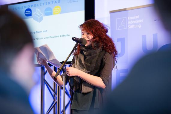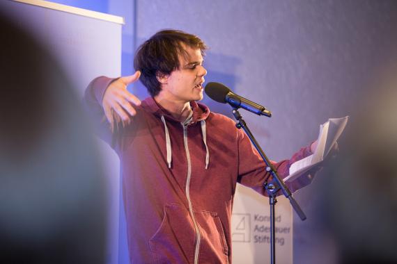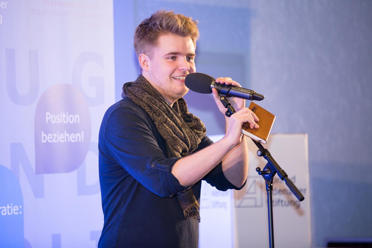 Demokratie- was hat das mit dir zu tun? Wortgewaltige Antworten lieferten die Nachwuchstalente Pauline Cebulla, Max Gebhard und Nick Pötter in ihren Poetry Slams. „Die Antwort ist einfach, die Antwort ist schwierig. Wir haben eine Stimme und wir müssen sie nutzen“. Mit dieser Botschaft beendete Nick Pötter seinen Auftritt.