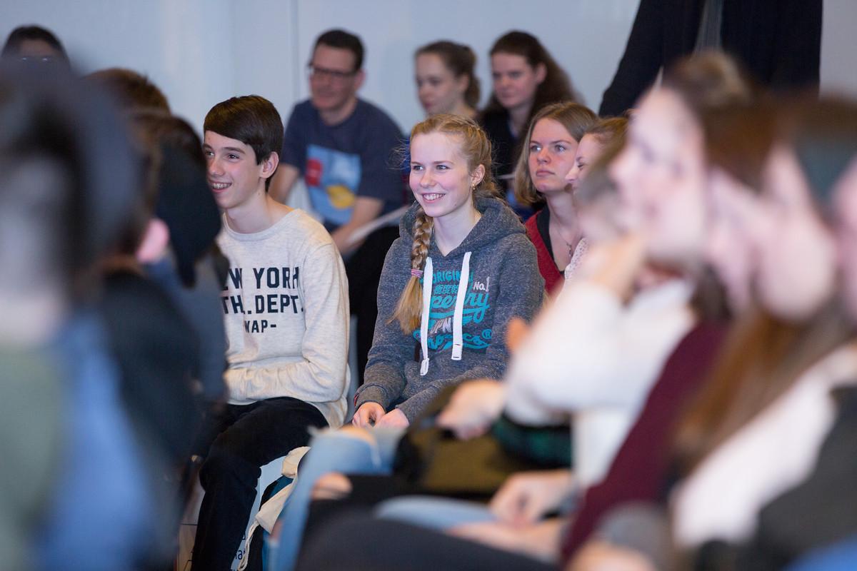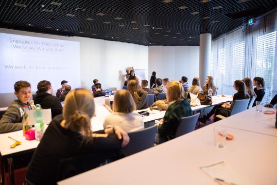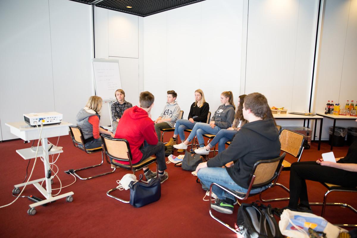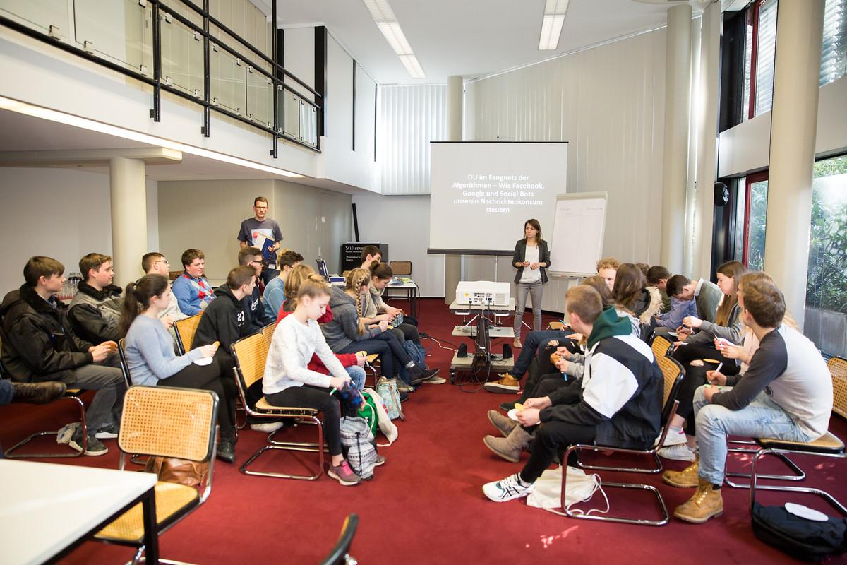 In den Workshops „Zuschauen oder mitmachen: Wie sieht deine Demokratie der Zukunft aus?“ oder „Du im Fangnetz der Algorithmen – Wie Facebook, Google und Social Bots unseren Nachrichtenkonsum steuern“ oder „Populärer Populismus? Politischer Poetry Slam“ wurde dann am Nachmittag kreativ in Kleingruppen gearbeitet. Ob Poetry Slam, Podcast oder Video: die Ergebnisse konnten sich allemal sehen lassen (z.B. der Podcast Nils rechte Spalte.) und wurden mit tosendem Applaus bei der Abschlusspräsentation honoriert.