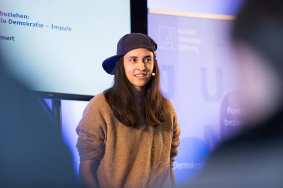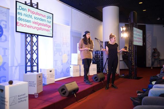 Bei der sich anschließenden Powerpoint-Kararaoke zum Populismus entstand eine angeregte Diskussion zu dessen Kerneigenschaften und Ausprägungen. Das Fazit lautete: den einen Populismus gibt es nicht. Vielmehr zeige er sich vielfältig. Diana Kinnert und die Moderatorin Luisa Meisel warnten eindringlich davor, sich von einfachen Antworten für komplexe politische Problemen blenden zu lassen.