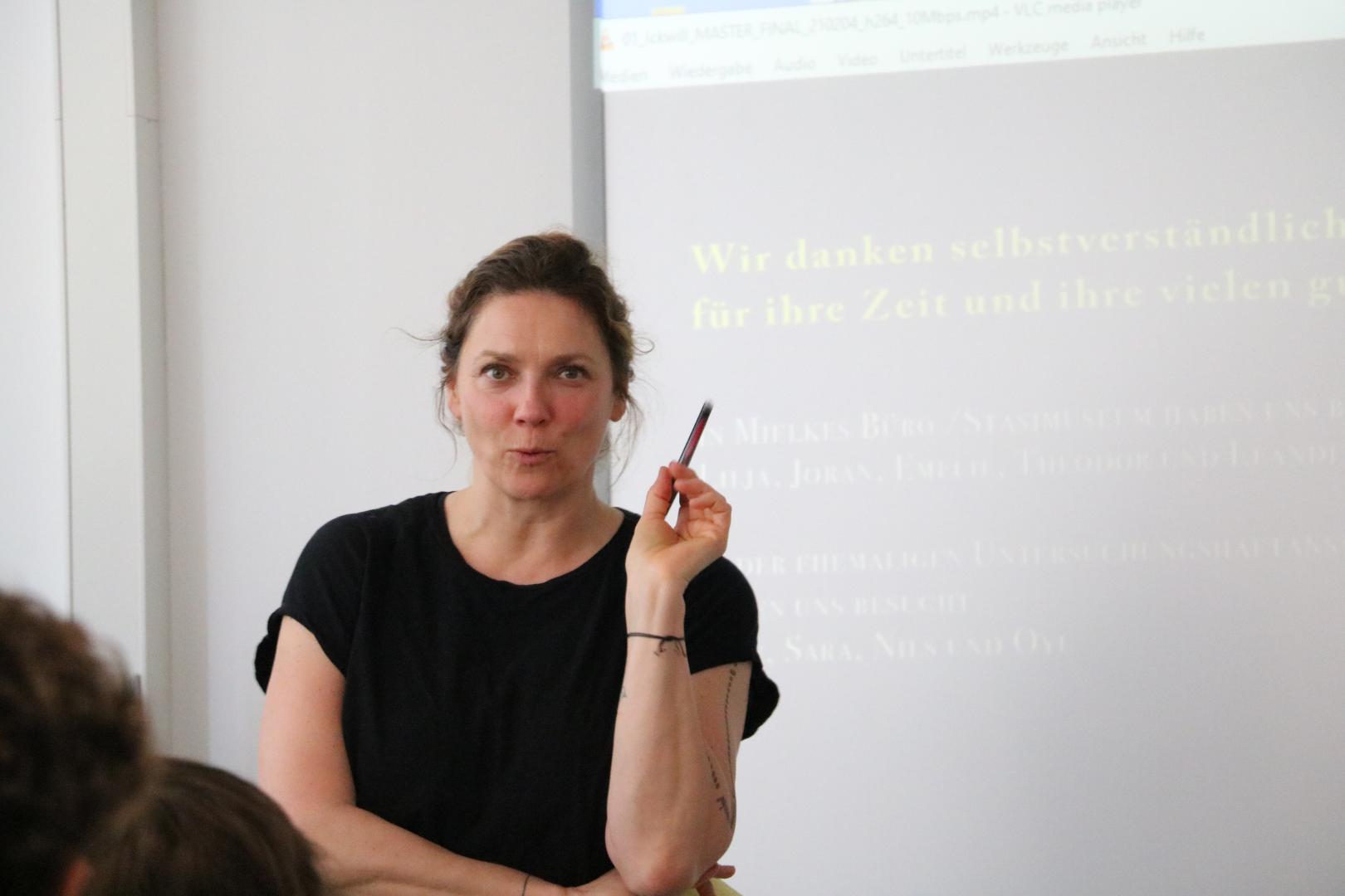 In dem Film „Wir wolln Euch mal wat fragen“ zeigten Nadja Klier und Ingo Hasselbach prägende Orte ihrer Vergangenheit - immer im aktiven Dialog mit den Jugendlichen. Nadja Klier las im Film aus ihrer Stasi Akte am historischen Schreibtisch von Erich Mielke, dem ehemaligen Minister für Staatsicherheit in der DDR vor.