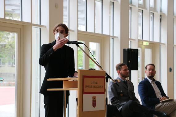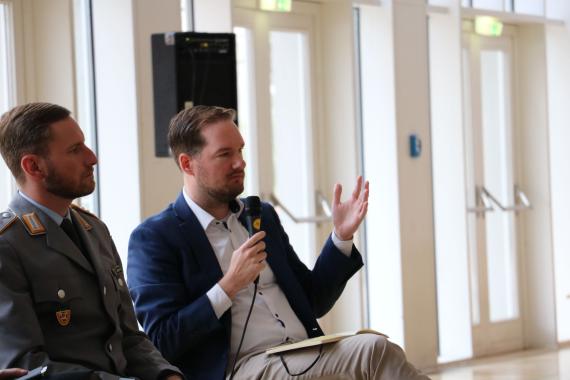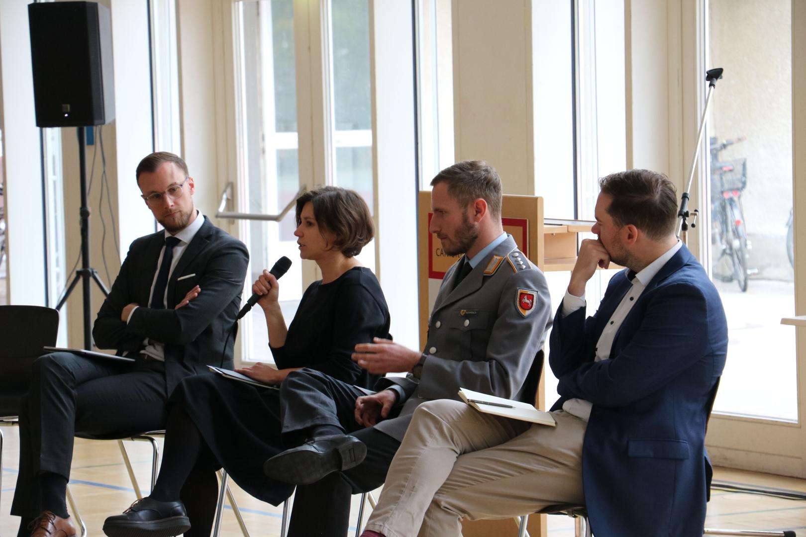 Das anschließende Podiumsgespräch wurde von Dr. Philipp Dienstbier, Referent für transatlantische Beziehungen der Konrad-Adenauer-Stiftung, moderiert. Die Gesprächsteilnehmer waren Alena Epifanova, Research Fellow der Deutschen Gesellschaft für Auswärtige Politik, der Jugendoffizier der Bundeswehr aus Potsdam Hauptmann Norman Sehmisch und Rafael Loss, Mitglied im European Council on Foreign Relations. Im Kern ging es um die Entwicklung des russischen Angriffskrieges, insbesondere mit Blick auf die Folgen für die EU und Deutschland.