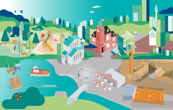 Was ist eigentlich eine Kommune? Was wird dort entschieden und welchen Einfluss hat das auf mein Leben? In der interaktiven Beispielkommune erkundeten die Teilnehmenden die Antworten auf diese Frage selbst. Hinter den verschiedenen Orten auf der interaktiven Grafik verbergen sich Quizze, Spiele und Positionslinien, auf denen man sieht, wie andere zum Beispiel ihren Einfluss auf die Kommune einschätzen. Sind Sie neugierig auf die interaktive Kommune? Hier geht es lang.