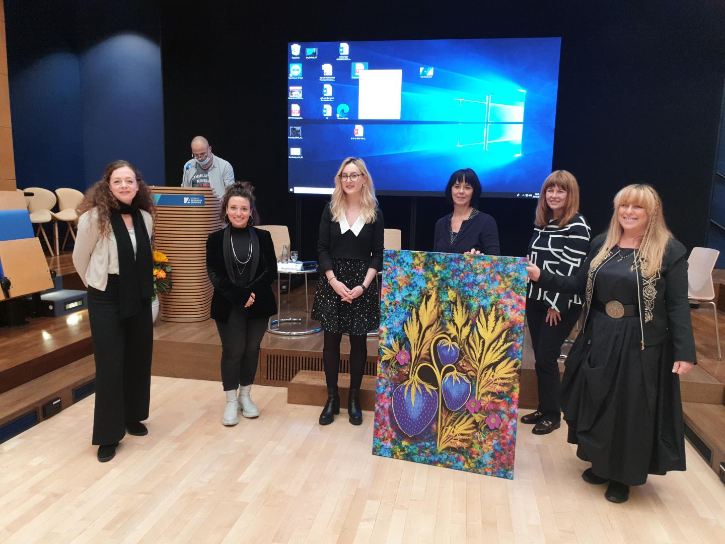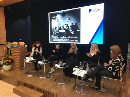 Im Anschluss hieran begann die Gesprächsrunde, die von der Journalistin Shelly Kupferberg moderiert wurde und an der Dr. Elena Solominski, Anna Staroselski (Präsidentin der Jüdischen Studierendenunion Deutschland), Laura Cazes (Leitung Kommunikation und Digitalisierung, Zentralwohlfahrtsstelle der Juden in Deutschland e.V.) und Diana Sandler (Beauftragte gegen Antisemitismus und Beauftragte für den Dialog mit den Religionsgemeinschaften im Land Brandenburg, Vorsitzende der Jüdischen Gemeinde Landkreis Barnim e. V.) teilnahmen.