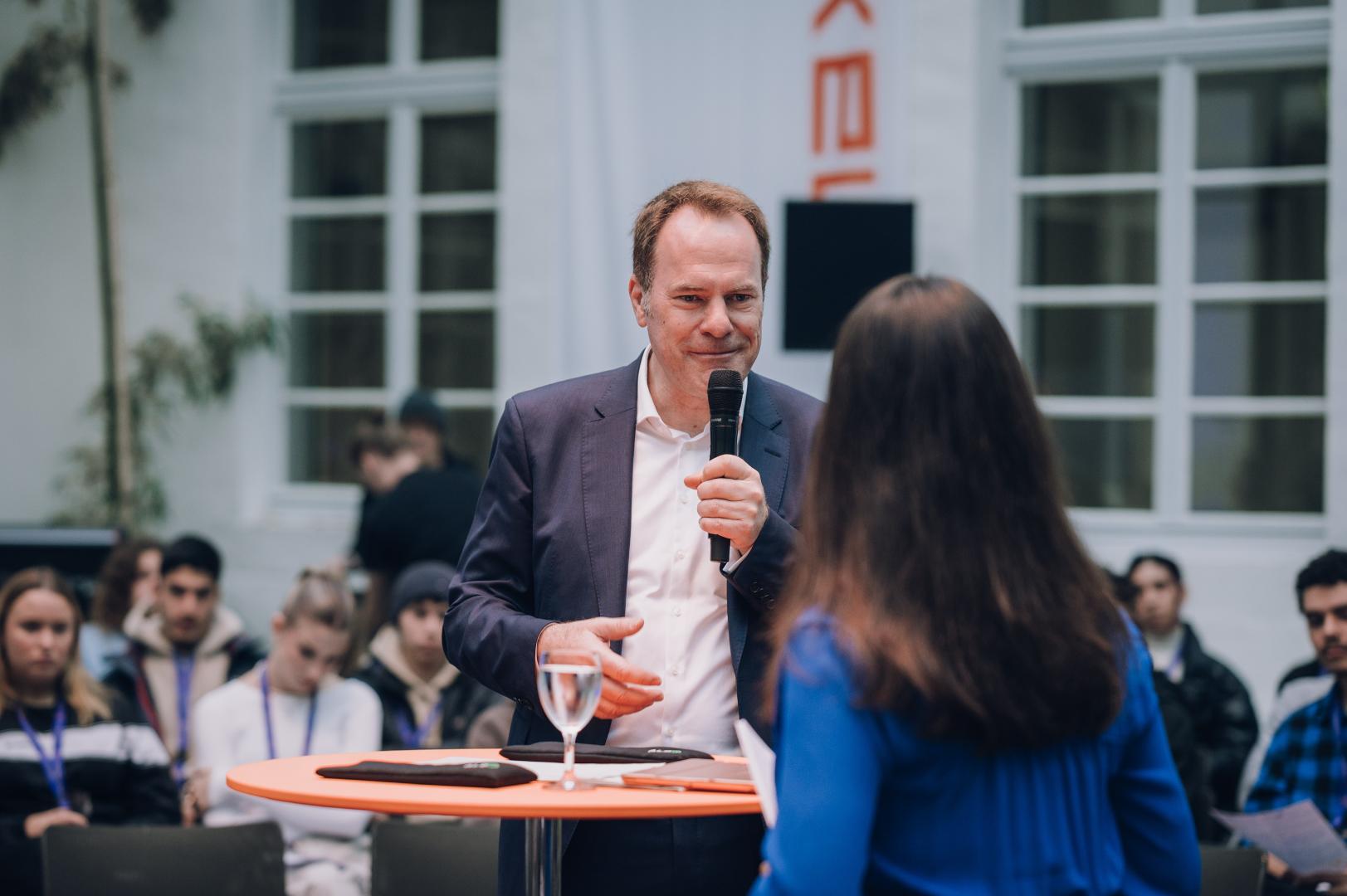 Nach dem Interview mit Dr. Stephan Keller hatten die Jugendlichen die Gelegenheit, an einem interaktiven Europaquiz der Jungen Europäischen Förderalisten NRW teilzunehmen, bei dem sie in über 20 Fragen ihr Wissen rund um das Thema Europa unter Beweis stellten. Pia Wirtz, die Co-Vorsitzende der JEF Düsseldorf, stand den Schülerinnen und Schülern im Anschluss in einer offenen Debatte für Fragen zur Verfügung. Neben ihr diskutierten sie gemeinsam mit Hendrik Nahr, der Landtagsabgeordneten Annika Fohn und dem Singer-Songwriter Fabrice über ihre Ideen für Europa.