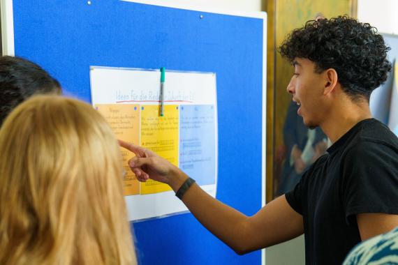 In einer anschließenden Abschlussrunde präsentierten die Schülerinnen und Schüler im Plenum ihre Ergebnisse und Erkenntnisse aus den einzelnen Workshops. Eine Gruppe hatte zusätzlich zu Plakaten einen eigenen Kurz-Podcast produziert.