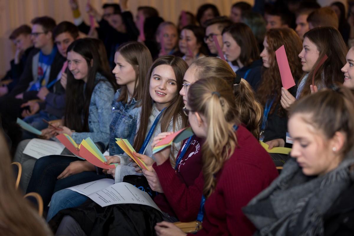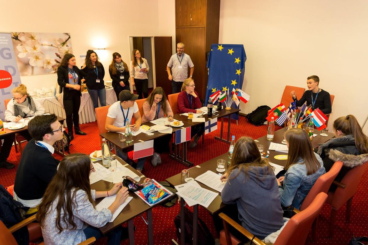 Dann dürfen die Schüler selbst ran: In acht verschiedenen Workshops erarbeiten sie ihre Ideen für Europa. In einem Instagram-Workshop sammeln die Jugendlichen Filme und Fotos, in denen sie zeigen, was Europa für sie bedeutet. In einem Workshop beschäftigen sich die Schüler mit dem Thema Flucht: Viele der Geflüchteten kommen mit Plastiktüten in Europa an. Symbolisch werden die wichtigsten Dinge, die sie auf der Flucht mitnehmen, in eine Plastiktüte gepackt. In einem anderen Workshop berichtet die die 17-Jährige Syrerin Bushra Ali Kouja von den unterschiedlichen Regeln in Syrien und Deutschland. Wie schwierig die Anpassung an eine neue Gesellschaft sein kann, erleben die Schüler symbolisch in einem Spiel. Das Verhältnis von Islam und Christentum ist Thema eines weiteren Workshops: Auf einer Basis aus Grundrechten können beide Religionen nebeneinanderstehen und sich gegenseitig inspirieren, ist die Antwort der Schüler.