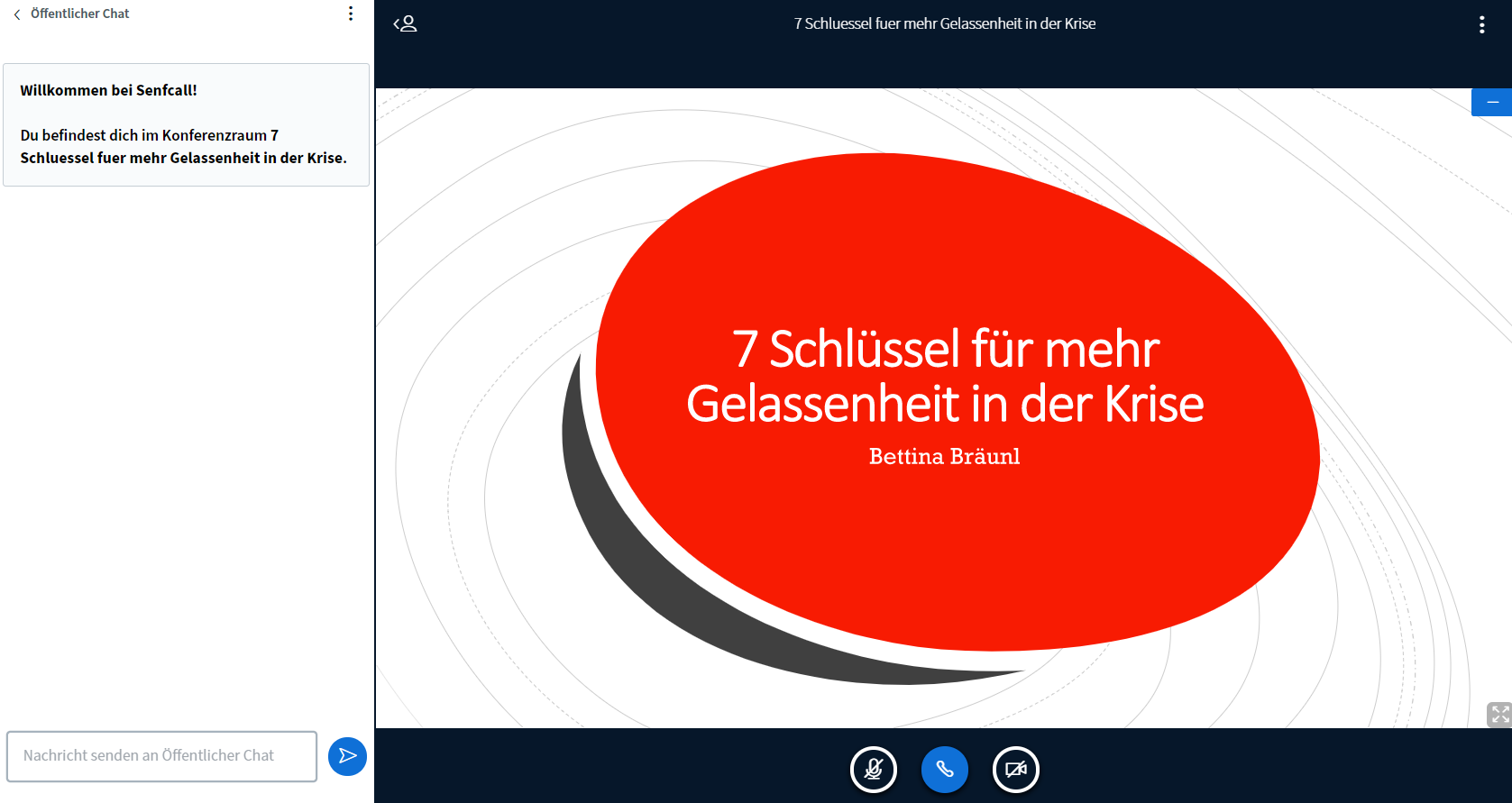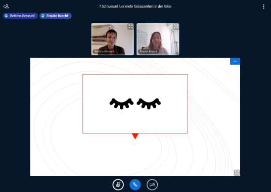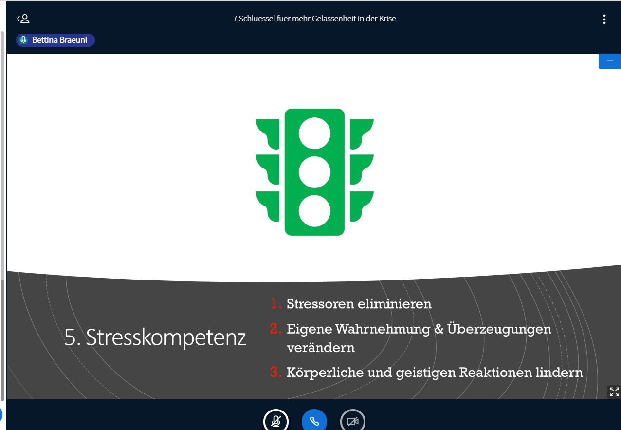 In dem Webinar geht es viel um die Selbstreflektion der Teilnehmerinnen. In einer Einzelarbeit schreiben die Teilnehmerinnen auf, was sie glücklich macht. In der Auflösung der Übung erklärt Bräunl, dass die meisten Menschen ihr Glück über die Zukunft definieren: „Wenn ich einen besseren Job hätte, wäre ich glücklich, oder wenn ich mehr Geld hätte, wäre ich glücklich.“. Dabei kann man nur im Hier und Jetzt glücklich sein, sagt Bräunl. Wie das geht, erklärt sie anhand von sieben Schlüsseln.