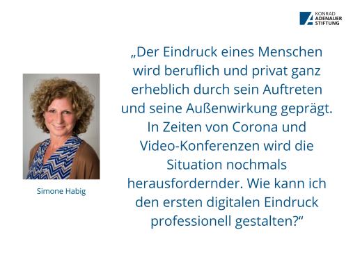 Diese Fragen beantwortete Imme Vogelsang, Trainerin für Wirkungskompetenz und Empathie, in einem Online-Workshop. In ihrer Begrüßung ging die Leiterin des Regionalbüros Rheinland der Konrad-Adenauer-Stiftung, Simone Habig, auf die steigende Nutzung von Video-Konferenzen im beruflichen Kontext ein: „Der Eindruck eines Menschen wird beruflich und privat ganz erheblich durch sein Auftreten und seine Außenwirkung geprägt. In Zeiten von Corona und Video-Konferenzen wird die Situation nochmals herausfordernder. Wie kann ich den ersten digitalen Eindruck professionell gestalten?“