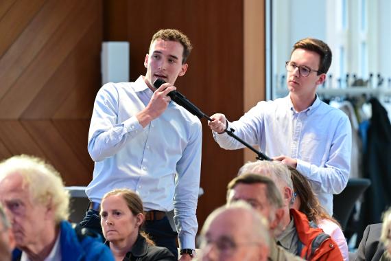 Nico Lange eröffnete seinen Vortrag mit einem Appell, die Menschen in der Ukraine stets im Blick zu behalten, wenn über sie gesprochen wird. Er begann mit einem Rückblick auf die Ursachen und Motive von Putins Krieg gegen die Ukraine und verdeutlichte, dass dieser darauf abzielt, die Sicherheitsordnung Europas grundlegend zu verändern. Neben der Analyse vergangener Ereignisse richtete der Sicherheitsexperte den Fokus gemeinsam mit dem Publikum auf zukünftige Entwicklungen. Dabei betonte er die Dringlichkeit, den Ukrainern Hoffnung zu vermitteln und ihnen Unterstützung in Form von Infrastrukturaufbau und Investitionen zukommen zu lassen. Zusätzlich zu seinen Analysen aus über zwei Jahren Kriegsbeobachtung hob Lange hervor, dass Deutschland und die Europäer zwar oft das Richtige getan haben, jedoch häufig zu zögerlich und zu langsam. Er plädierte dafür, schneller und entschlossener zu handeln, um den Herausforderungen effektiv zu begegnen.