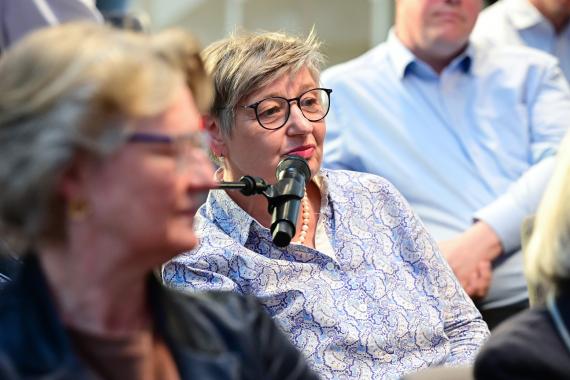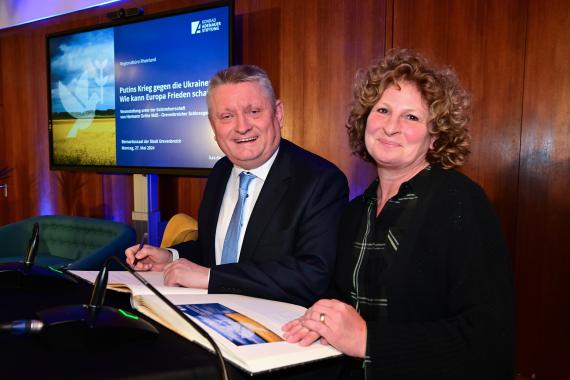 Simone Gerhards, Leiterin des Regionalbüros Rheinland, eröffnete das Grevenbroicher Schlossgespräch und begrüßte das Publikum. Im Fokus des Abends stand die Frage, wie Europa nach Ausbruch des russischen Angriffskriegs Frieden schaffen kann. In ihrer einführenden Rede unterstrich sie den Diskurs zwischen den europäischen Ländern, aber auch innerhalb Deutschlands, wie und mit welchen Mitteln der Ukraine jetzt geholfen werden müsse, und betonte, dass der Druck auf Europa so groß wie nie sei. Simone Gerhards hob hervor: "Unsere Sicherheitsinteressen werden nicht nur durch den Angriffskrieg auf die Ukraine, sondern auch weltweit von Ländern wie Russland, China und dem Iran herausgefordert."