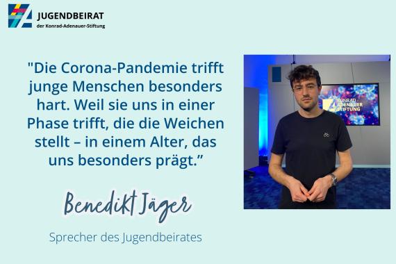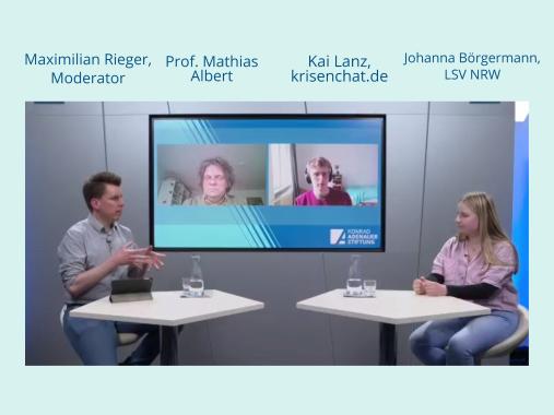 Gemeinsam mit den Zuschauerinnen und Zuschauern sprechen Johanna Börgermann von der Landesschüler*innenvertretung NRW, Kai Lanz, Mitgründer und CEO von krisenchat.de und der Politikwissenschaftler Prof. Mathias Albert über diese Fragen. In ihrem Grußwort betont die Leiterin des Regionalbüros Rheinland, Simone Gerhards, wie wichtig es ist, direkt mit Jungen zu sprechen: „Junge Menschen sind nicht nur in ihrer Rolle als Schülerinnen und Schüler, Studierende oder Auszubildende getroffen: Für sie sind soziale Kontakte und öffentliche Rückzugsräume häufig sehr wichtig.“ Benedikt Jäger, Sprecher des Jugendbeirates des KAS, ergänzt: „Corona trifft junge Menschen besonders hart. Weil es uns in einer Phase trifft, die die Weichen stellt – in einem Alter, das uns besonders prägt.“