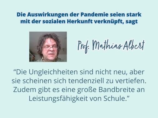 Kai Lanz hat mit Krisenchat.de ein gemeinnütziges Unternehmen mitgegründet, das jungen Menschen psychosoziale Beratung per Chat anbietet. Ein Großteil der Probleme, mit denen sich junge Menschen an sie wenden, seien unabhängig von Corona: „Da sieht man einfach eine unglaubliche Versorgungslücke, die es in dem Bereich gibt.“ Dass es vor der Pandemie schon Ungleichheiten gab, bestätigt Jugendforscher Mathias Albert: „Die Pandemie hat ja nicht nur Probleme erzeugt, sondern auch bestehende Probleme offengelegt.“ So werde der Einfluss der sozialen Herkunft auf den Bildungserfolg durch die Pandemie verstärkt. Johanna Börgermann, die sich in der Landesschüler*innenvertretung NRW engagiert, spricht den Druck an, unter dem viele Schülerinnen und Schüler stehen: „Das ist sehr frustrierend, wenn Präsenzunterricht mit Distanzunterricht gleichgesetzt wird, weil das einfach nicht klappt.“ Sie sieht dahinter ein strukturelles Problem: Es sei vorher zu wenig in Bereichen wie Digitalisierung, Sozialarbeit in Schulen und Weiterbildung von Lehrkräften getan worden.