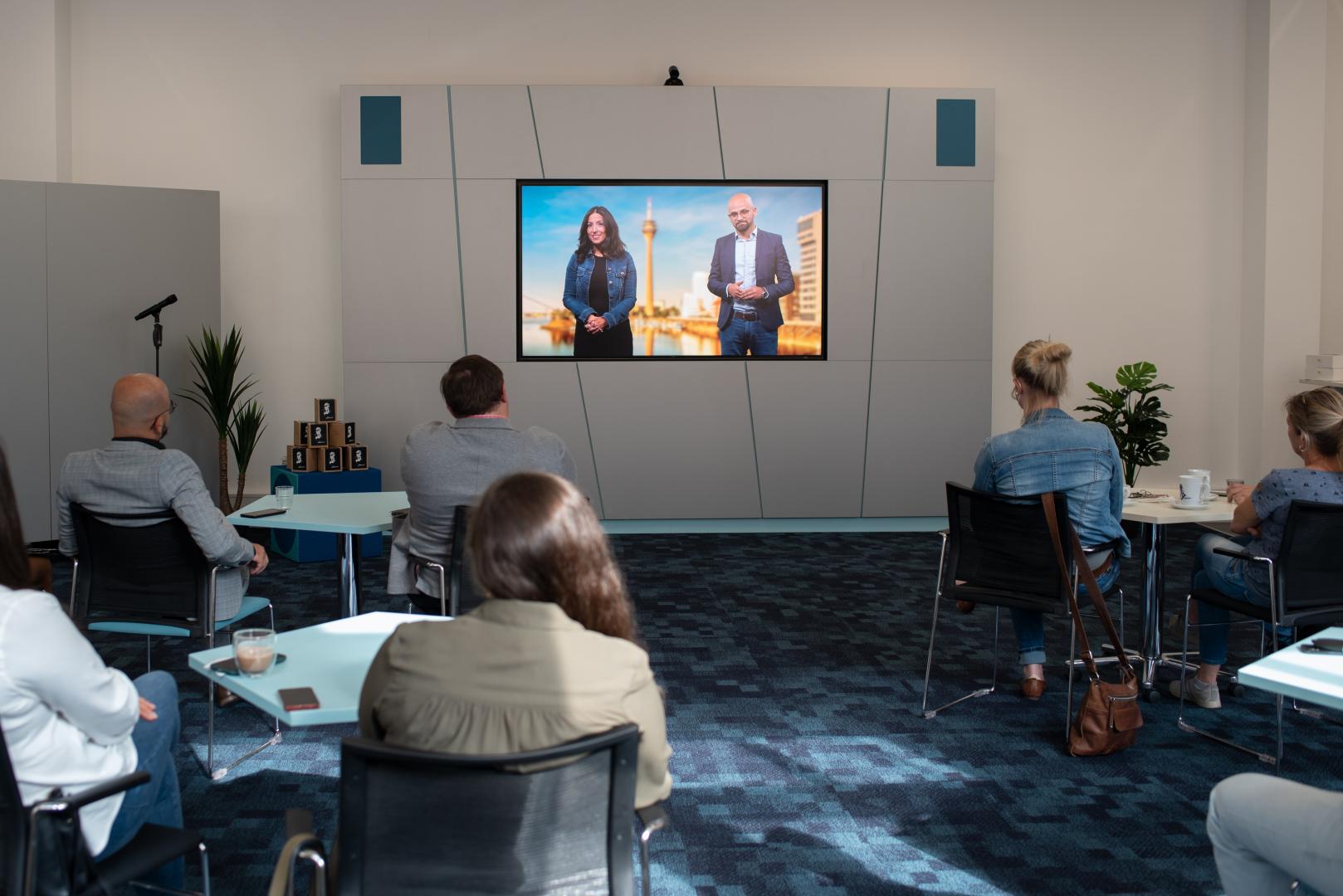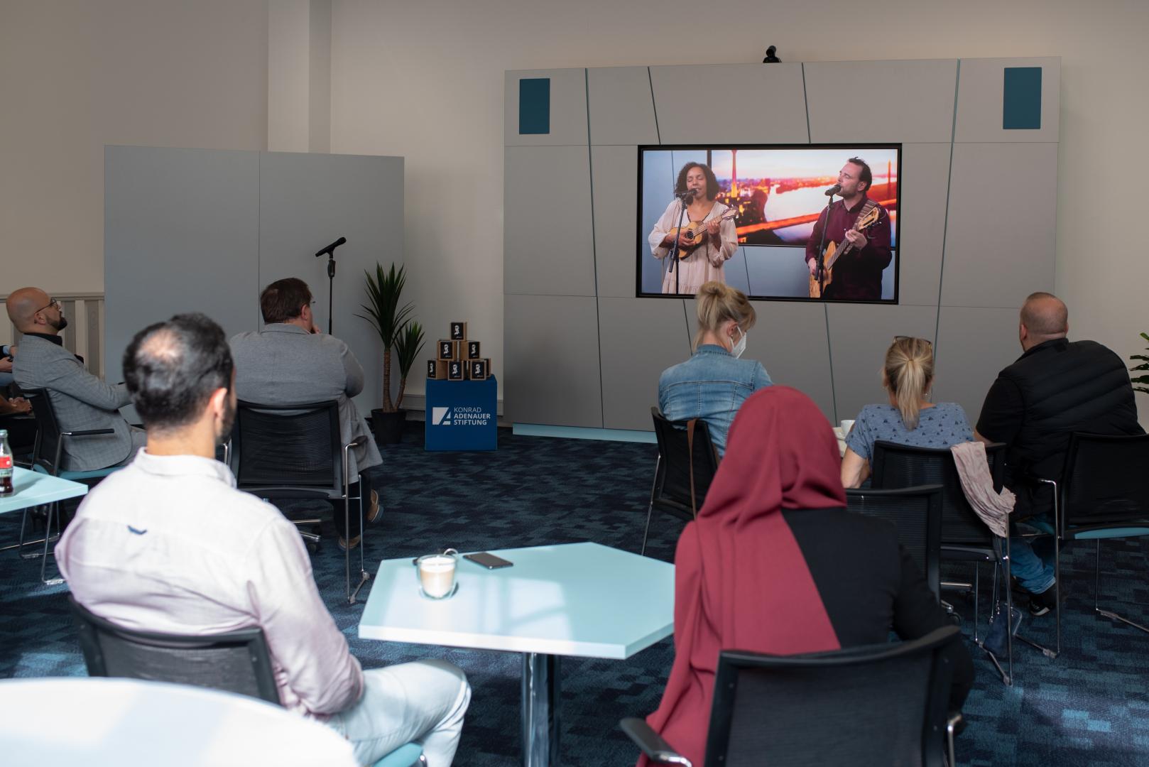 Um die Veranstaltung im Rahmen der Covid-19 Schutzmaßnahmen durchzuführen, sind einige Gäste digital dazugeschaltet: Viele Schulleitungen sind gekommen, um die erfolgreiche Teilnahme ihrer Lehrkräfte zu feiern. Musikalisch unterstützt wird die Veranstaltung von dem Duo „White Coffee“: Mit Ukulele und Gitarre stimmen sie die Gäste ein und spielen sowohl eigene Lieder als auch Cover-Songs. Im Anschluss begrüßen die Kooperationspartner der Qualifizierungsmaßnahme über Video-Botschaften die Gäste und Lehrkräfte. Ahmet Atasoy und Atika Müller-Erogul vom Netzwerk Lehrkräfte mit Zuwanderungsgeschichte sind stolz auf die Absolventinnen und Absolventen: Durch die Corona-Pandemie sei die Ausbildung anders verlaufen. Einige Module mussten komplett digital umgesetzt werden, sagt Atasoy: „Trotzdem sind die Inhalte gut angekommen und vor allem der Austausch hat gut geklappt.“ Sie wünschen den Lehrkräften zum Abschluss alles Gute für die Umsetzung und bieten weitere Unterstützung und Zusammenarbeit an.