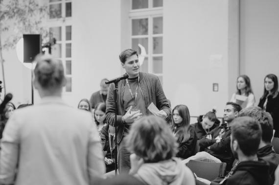 Mit einem Poetry Slam leitete die Poetin Miedya Mahmod in das Thema Europa ein und regte die Schüler*innen dazu an, auch kritisch auf Europa zu schauen. In einer offenen Debatte, an der Miedya Mahmod, der Landtagsabgeordnete Daniel Scheen-Pauls, Hendrik Nahr und die Vorsitzende der Jungen Europäischen Föderalist:innen – Pia Wirtz teilnahmen, diskutierten sie ihre Ideen für Europa. Einig waren sich die Redner*innen darin, dass wir in Europa mehr miteinander ins Gespräch kommen sollten - auch über Grenzen hinweg.