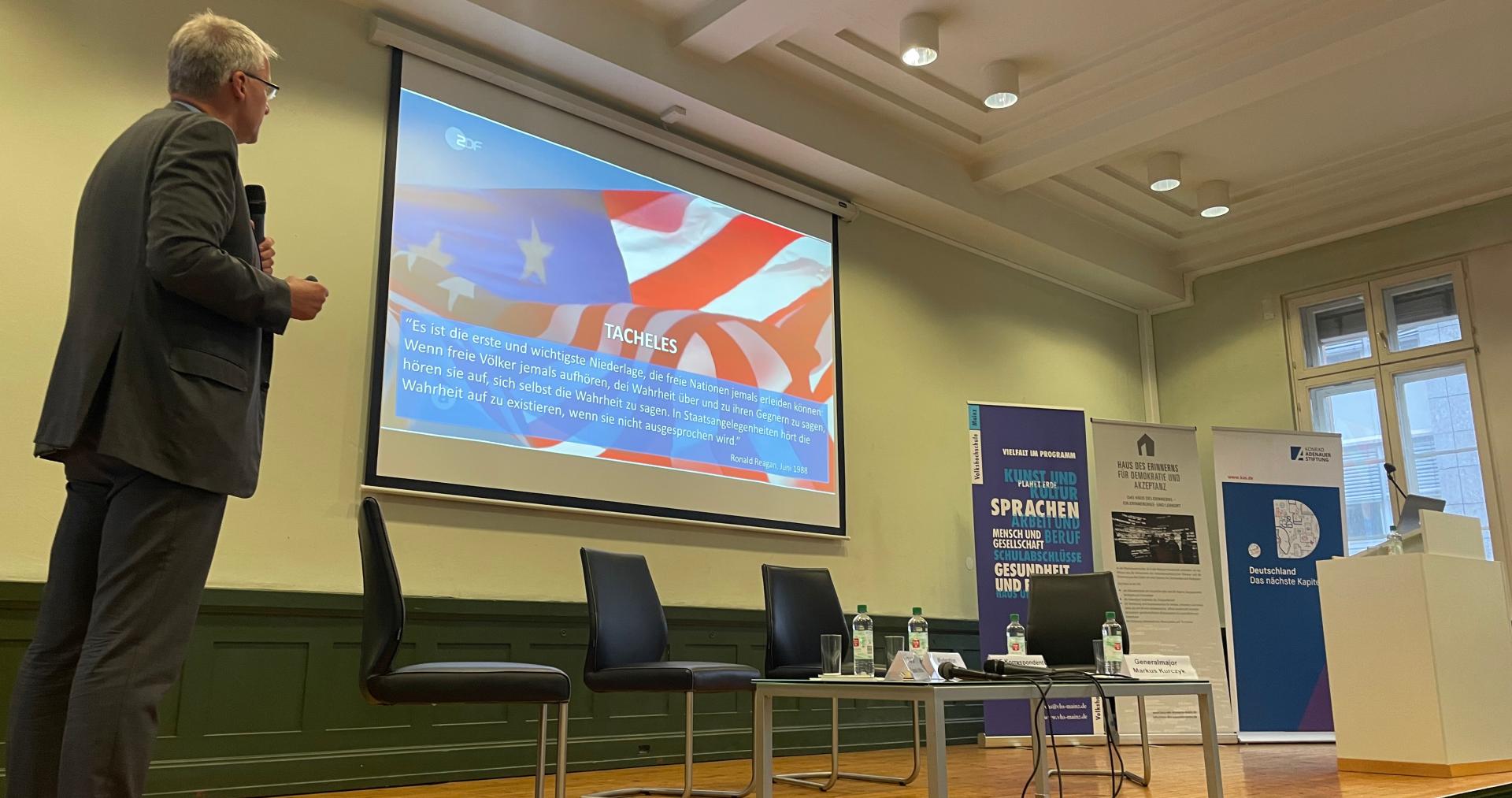 Seit über einem Jahr begleitet Russlands völkerrechtswidriger und imperialistischer Angriffskrieg auf die Ukraine das tägliche Mediengeschehen und die politischen Debatten über die deutsche, europäische und internationale Sicherheitspolitik. Gemeinsam mit dem Haus des Erinnerns – für Demokratie und Akzeptanz Mainz, der Volkshochschule Mainz und dem Wochenschau Verlag hat das Politische Bildungsforum Rheinland-Pfalz der Konrad-Adenauer-Stiftung e.V. einen Vortrag von Elmar Theveßen, ZDF-Studioleiter in Washington, mit anschließender Podiumsdiskussion organisiert. Prof. Dr. Sabine Schiffer, Medienwissenschaftlerin der Hochschule für Medien, Kommunikation und Wirtschaft aus Frankfurt, Generalmajor Markus Kurczyk, Kommandeur des Zentrums Innere Führung der Bundeswehr, Elmar Theveßen und Moderator Hans Berkessel, Vorsitzender der Stiftung Haus des Erinnerns, diskutierten über die die Zukunft der europäischen Sicherheitsordnung, über die facettenreiche Medienberichterstattung und über die Bundeswehr der Zukunft.