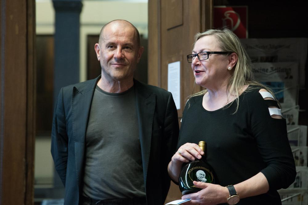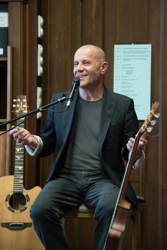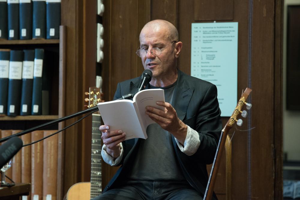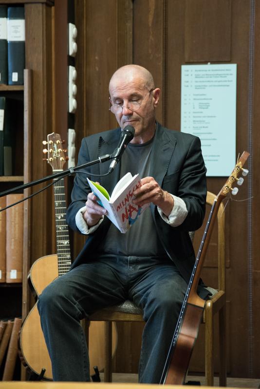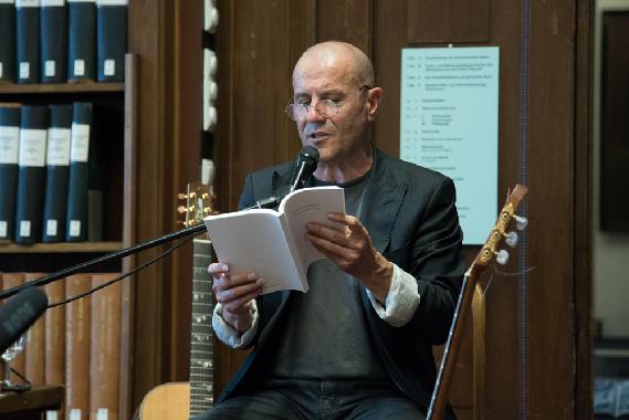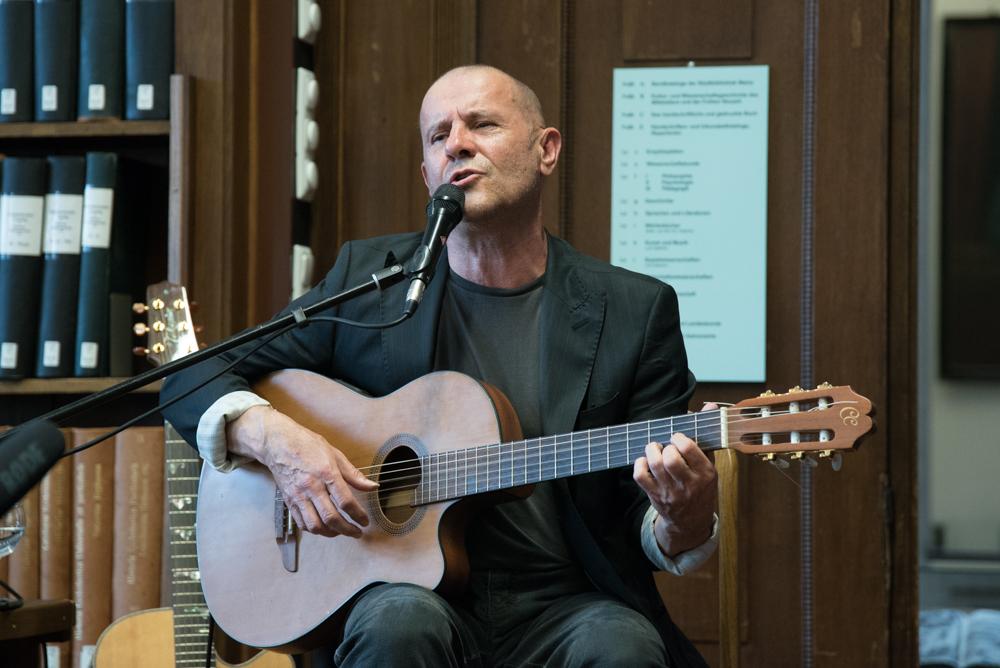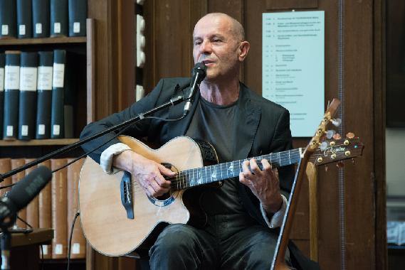 Dr. Stephan Fliedner, Direktor der Bibliotheken der Stadt Mainz, begrüßt den „Stammgast“ der Konrad-Adenauer-Stiftung und der Mainzer Stadtbibliothek Stephan Krawczyk als herausragenden Künstler, auf dessen kritische Gedanken man sich stets freue.