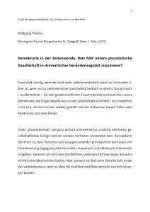 Sodann hielt Bundestagspräsident a. D. Wolfgang Thierse einen Vortrag zum Thema "Demokratie in der Zeitenwende. Was hält unsere pluralistische Gesellschaft in dramatischer Veränderungszeit zusammen?". Darin beschrieb er zunächst die aus seiner Sicht größten Herausforderungen: Globalisierung, Pluralisierung der Gesellschaft, Integration, Veränderungen der Arbeitswelt durch Digitalisierung und Künstliche Intelligenz, ökologische Bedrohung, Terrorismus, Gewalt und nicht zuletzt der Angriffskrieg Russlands auf die Ukraine. Wie sehr habe man 1989 und in den darauffolgenden Jahren vom goldenen Frieden und vom Sieg der Demokratie geträumt! Wie sehr habe man auf das deutsche Erfolgsmodell, auf politische und soziale Stabilität vertraut, auf den Fortschritt als das Fundament der Moderne gesetzt, sich auf einer Insel der Glückseligen gewähnt! Der von Bundeskanzler Scholz ins öffentliche Bewusstsein geprägte Begriff der Zeitenwende reagiere angemessen auf die aktuelle „tiefe Erschütterung“, eine „höchst folgenreiche Wendung der Geschichte“, die ganz anders als die Wende von 1989/1990 menschliches Leid, Tod, Flucht, Konfrontationen, ökonomische, soziale und finanzielle Zuspitzungen oder Belastungen mit sich bringen würde. Der Aggressionskrieg Russlands und seine Folgen bedeuteten „eine erhebliche Herausforderung für das Innere unserer Gesellschaft, für deren sozialen Zusammenhalt“. Der Krieg habe unsere Hoffnung auf eine durch Regeln und Verträge geordnete und sichere Welt des Friedens empfindlich getroffen. Jetzt werde sich, so Dr. Thierse, erweisen müssen, „ob unsere Demokratie eine Schönwetterdemokratie gewesen ist“: „Denn die Existenzgrundlagen der alten Bundesrepublik waren doch wirtschaftliches Wachstum und stabile Wohlstandsmehrung. Das begründete und ermöglichte die Stabilität unserer Demokratie. Was wird aus ihr werden, wenn diese Grundlage für nicht absehbare Zeit nicht mehr so sicher ist wie gewohnt. Wenn die materiellen und kulturellen Verteilungskonflikte sich, nicht nur in unserem Land, sondern global, verschärfen? Das ist die entscheidende Frage bei dem, was Zeitenwende wirklich bedeutet und bedeuten muss, weit über das Militärische hinaus.“ Zeiten wie diese schürten das individuelle und kollektive Bedürfnis nach neuen und auch alten Vergewisserungen und Verankerungen, nach Identität, nach Sicherheit, nach Beheimatung. Dabei seien die Gefühle der Unsicherheit, der Gefährdung des Vertrauten und Gewohnten, der Infragestellung dessen, was Halt und Zusammenhalt gegeben habe, der ökonomischen Abstiegsängste, der sozialen Überforderungsgefühle, der kulturellen Entheimatungsbefürchtungen und tiefgehende Zukunftsunsicherheiten höchst ungleich verteilt, worauf es in besonderer Weise zu achten gelte. Zeiten heftiger Veränderungen und Verunsicherungen seien immer auch Zeiten für Populisten, für die Vereinfacher und Schuldzuweiser – dies gelte in besonderer Weise, aber keinesfalls nur für den Osten Deutschlands, wie man während der Corona-Pandemie habe beobachten können. Die Stimmung sei gereizter, die Konfrontationen würden schärfer, Aggressivität nehme zu. Hierbei sei nicht mehr nur die vertraute und notwendige Auseinandersetzung politischer Parteien und nicht mehr nur das Austragen der gewohnten sozialökonomischen Verteilungskonflikte zu beobachten, sondern eine Auseinandersetzung auf kultureller Ebene verstärkt worden, wie Dr. Thierse am Beispiel von teils heftigen Reaktionen auf seinen Essay in der Frankfurter Allgemeine Zeitung „Wieviel Identität verträgt die Gesellschaft“ aus dem Jahr 2021 veranschaulichte. In diesem Zusammenhang widmete er sich intensiv der zentralen Frage des Abends „Was hält eine diverse Gesellschaft zusammen? Wie ist die Kommunikation einer vielfältigen Gesellschaft so möglich, dass sie verbindet und nicht entzweit?“ Mit der Devise „Wer in einer Demokratie etwas für Minderheiten erreichen will, wer etwas verändern will, der muss dafür Mehrheiten gewinnen!“ warb Dr. Thierse intensiv für die „Mühsal von Verständigungs- und Veränderungsprozessen“, für Balance, das Austarieren von Identitäten von Individuen und Gruppen, für die Bereitschaft, „das Eigene in Bezug auf das Gemeinsame, auf das Gemeinwohl zu denken und zu praktizieren, also auch das Eigene zu relativieren.“ Er zeigte sich überzeugt: „Wenn Vielfalt, Diversität, Pluralität friedlich und produktiv gelebt werden sollen, dann müssen sie mehr sein als das bloße Nebeneinander sich voneinander nicht nur unterscheidender, sondern auch abgrenzender Identitäten und Minderheiten. Dann müssen sie mehr sein als das Gegeneinander von Ansprüchen und Betroffenheiten.“ Vielfalt erzeuge nicht von alleine eine Gemeinschaftlichkeit. An dieser und für diese müsse immer wieder neu gearbeitet werden. Der unabdingbare Respekt vor Vielfalt und Anderssein sollte in die Anerkennung von Regeln und Verbindlichkeiten auch von Mehrheitsentscheidungen eingebettet sein. Sonst sei der gesellschaftliche Zusammenhalt durch radikale Meinungsbiotope, tiefe Wahrnehmungsspaltungen und konkurrierende Identitätsgruppenansprüche gefährdet. Weil der Zusammenhalt in einer diversen, sozial und kulturell fragmentierten Gesellschaft nicht mehr selbstverständlich sei, müsse dieser Zusammenhalt ausdrücklich und noch deutlicher das Ziel von demokratischer Politik und von kulturellen und kommunikativen Anstrengungen sein. Für einen gelingenden gesellschaftlichen Zusammenhalt in einer offenen, entgrenzten, globalisierten, pluralistischen, ethnisch und religiös-weltanschaulich und kulturell, sozial und politisch vielfältigen, oft auch widersprüchlichen Welt empfahl Dr. Thierse: Die Menschen müssten immer wieder neu aufeinanderzugehen, kooperieren, begreifen, dass Integration eine doppelte Perspektive verlange und eine doppelte Aufgabe sei, an Demokratie, Kultur und Bildung partizipieren, das „gemeinsame Wir“ suchen, finden oder 