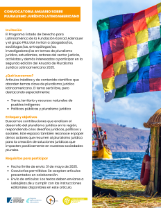 Buscamos contribuciones que analicen el desarrollo del pluralismo jurídico en la región, respondiendo a los desafíos jurídicos, políticos y sociales. Este espacio también reconoce el papel de los actores que recurren al pluralismo jurídico para la creación de soluciones jurídicas que impacten positivamente en nuestras sociedades plurales.