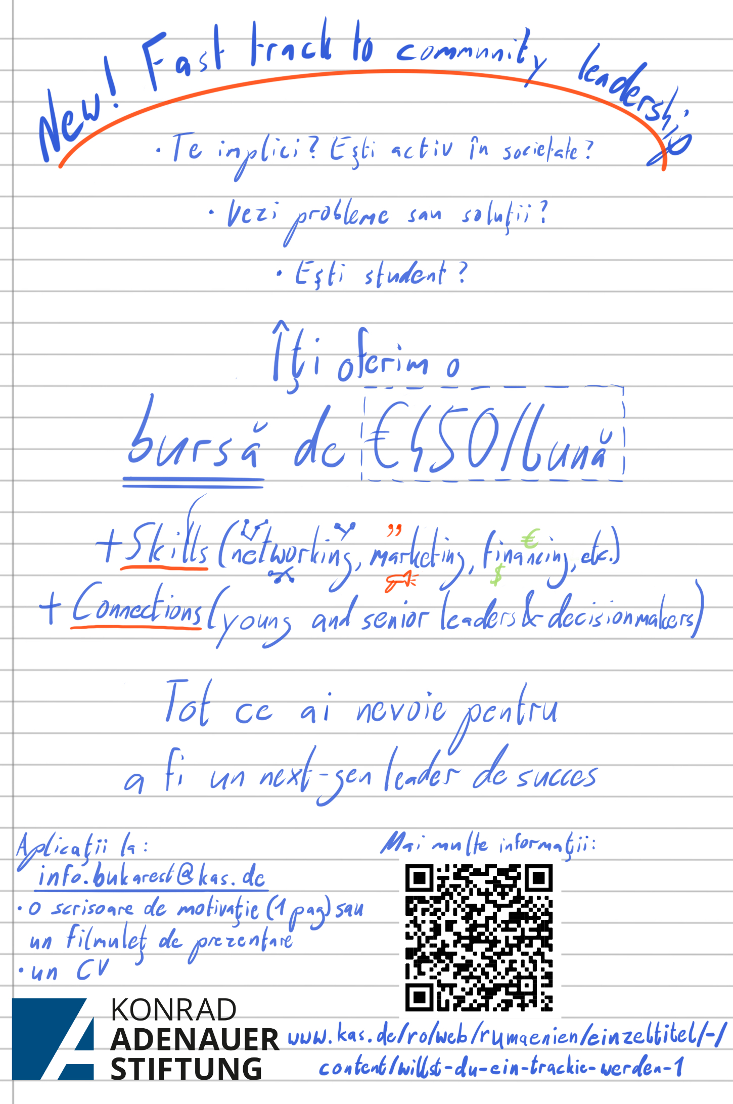 Die Konrad-Adenauer-Stiftung fördert junge Menschen, die Verantwortung für Rumänien übernehmen wollen: Werde ein „Trackie“ im Rahmen unseres Programms „Fast Track for Future Community Leaders“ und erhalte ein Stipendium in Höhe von 450 EUR pro Monat. Zusätzlich profitierst Du von einem studienbegleitenden Förder- und Coaching-Programm. Dabei kannst Du an „Skills“-Seminaren teilnehmen und Deine persönlichen Fähigkeiten weiterentwickeln. Ganz nebenbei bekommst Du von uns zudem Berufserfahrung im Bereich Projektmanagement und Politikgestaltung. Wir vernetzen Dich auch mit Institutionen und Entscheidungsträgern in Rumänien.