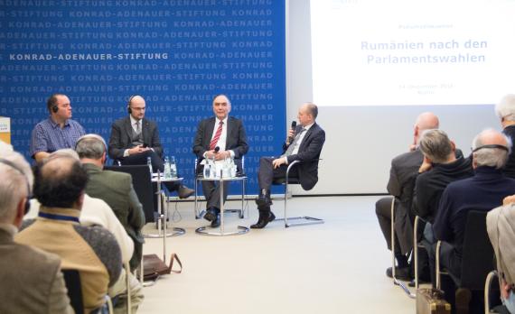 „Das Wahlergebnis hat uns weder außerordentlich überrascht, noch in besonderem Maße erfreut“, kommentierte Dr. Dr. Martin Sieg, angehender Büroleiter der Konrad-Adenauer-Stiftung in Bukarest und Moderator der Diskussion, den Ausgang der rumänischen Parlamentswahlen vom 11. Dezember. „Natürlich erkennen wir die demokratische Entscheidung der Rumänen an und wollen professionell mit der neuen Regierung zusammenarbeiten“, ergänzte Dr. Christoph Bergner, Abgeordneter des Deutschen Bundestags im Auswärtigen Ausschuss und Vorsitzender des Deutsch-Rumänischen Forums. „Gleichzeitig wollen wir als Christdemokraten unsere Partner der EVP-Parteien dabei unterstützen, eine gute Oppositionsarbeit zu betreiben“. Auch dies sei, so Bergner, wichtiger Bestandteil einer funktionierenden Demokratie. Florin-Alexandru Alexe, Parlamentsabgeordneter und Vizevorsitzender der Liberaldemokratischen Partei PNL, nahm das Angebot dankend auf und verwies gleichzeitig auf die Herausforderungen, die sich für seine Partei nach dem Rücktritt ihrer Vorsitzenden am Montag ergeben.