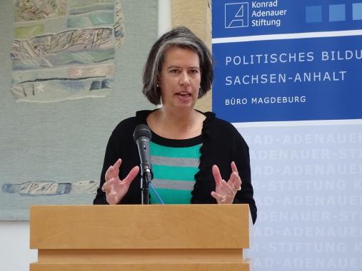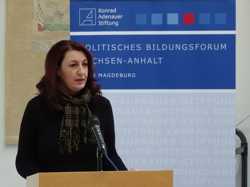 Staatssekretärin Dr. Tamara Zieschang (Ministerium für Inneres und Sport des Landes Sachsen-Anhalt) dankte der Konrad-Adenauer-Stiftung, das Thema aufgegriffen zu haben, und unternahm eine Begriffsdefinition, wonach Extremisten für eine Beseitigung der bestehenden Staats- und Gesellschaftsordnung eintreten, wenngleich mit unterschiedlicher Stoßrichtung. So wollen Linksextremisten ein marxistisch-leninistisches System errichten. In Sachsen-Anhalt ist der Anteil linksextremer Straftaten zuletzt leicht angestiegen (auf 12 Prozent), während von Rechtsextremisten 2/3 aller politisch motivierten Straftaten verübt werden. 2017 gab es in Sachsen-Anhalt 230 gewaltbereite Autonome sowie 240 Mitglieder in linksextremen Parteien und Gruppierungen. Hierbei sind insbesondere die MLPD und die DKP zu nennen, ebenso die Organisation Rote Hilfe, die in drei Ortsgruppen aktiv ist (Magdeburg, Halle, Salzwedel). Insgesamt gibt es in den Universitätsstädten Magdeburg und Halle sowie in Burg aktive linksextreme Szenen.