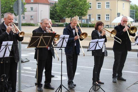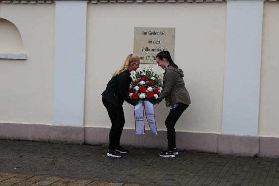 Nach Begrüßung durch Dr. Christof Günther (Geschäftsführer der InfraLeuna GmbH) und Alexandra Mehnert (Leiterin des Politischen Bildungsforums Sachsen-Anhalt der Konrad-Adenauer-Stiftung e.V.) wies Landrat Frank Bannert in seinem Grußwort darauf hin, dass Freiheit und Wohlstand heute selbstverständlich sind. Er selbst musste jedoch miterleben, wie ein Familien-Angehöriger in der DDR in einem politischen Verfahren zu einer anderthalbjährigen Haftstrafe verurteilt wurde. Nicht nur aufgrund dieses für ihn prägenden Erlebnisses mahnte er die Schülerinnen und Schüler zu Gesprächen innerhalb ihrer Familien, mit den Lehrern sowie mit weiteren Zeitzeugen, wie jene die DDR-Zeit erlebt haben. Für das Gedenken an die Opfer des Volksaufstandes vom 17. Juni 1953 lobte er die InfraLeuna GmbH, die in der Nähe des Haupttoren eine Gedenktafel angebracht hat, wo während der Veranstaltung unter musikalischer Begleitung des Posaunenchores Leuna durch Schülerinnen und Schüler Kränze niedergelegt wurden.