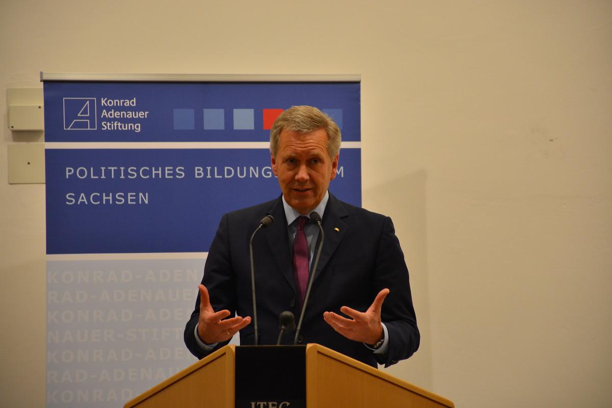 Im ersten Teil seines Vortrags analysierte Wulff die aktuelle gesellschaftspolitische Lage und konstatierte, dass es keine Garantie für die Demokratie gebe. Unser System stehe momentan unter einem enormen Druck. Vor diesem Hintergrund müsse man sich einmal vergegenwärtigen, dass es erst seit 27 Jahren Frieden in der Europäischen Union gibt. In den letzten 100 Jahren zuvor war Europa von zahlreichen Kriegen und Konflikten geprägt, so Wulff. Als Beispiel nannte er die Schlacht von Verdun, den Zweiten Weltkrieg und die deutsche Teilung. Es sei wichtig, nicht an die konfliktreiche Geschichte, sondern an das friedliche Miteinander anzuknüpfen. Als Ursachen für die sinkende Strahlkraft der liberalen Demokratie und die steigende Unsicherheit der Menschen führte Christian Wulff den Terrorismus, die negativen Seiten der Globalisierung und Digitalisierung an.