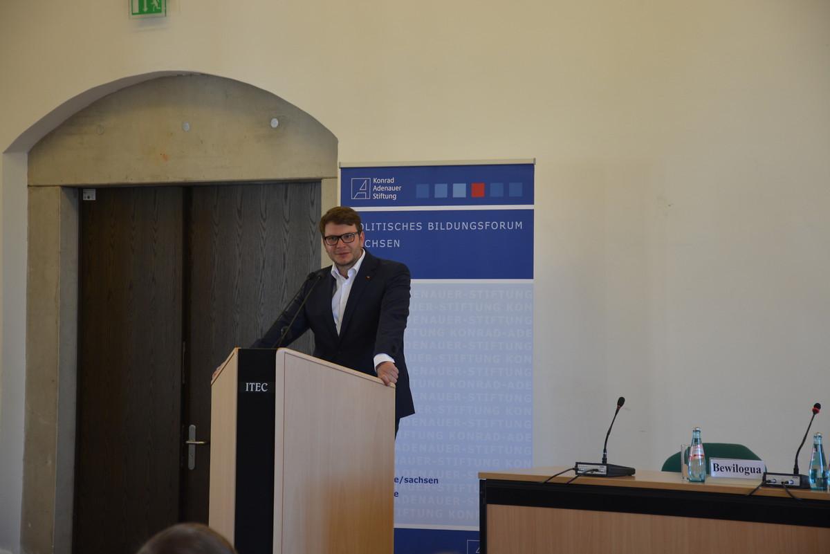 Zum Auftakt der Veranstaltung sprach Marian Wendt, Bundestagsabgeordneter für Nordsachsen, ein Grußwort. Darin beschrieb er aus seinen eigenen Erfahrungen als Politiker das Spannungsverhältnis von Gewissen und politischer Realität. Wendt konstatierte, dass sich in einigen Teilen der Öffentlichkeit das negativ geprägte Bild eines „Talkshowpolitikers“ etabliert habe. Dies habe auch zu einem Vertrauensverlust der Bürgerinnen und Bürger in die Politik geführt. Wichtig sei, das Vertrauen wieder zurück zu gewinnen und im Sinne Dietrich Bonhoeffers zu handeln. Das folgende Zitat des Theologen stelle für Wendt eine zentrale Leitlinie dar: „Nicht das Beliebige, sondern das Rechte tun und wagen, nicht im Möglichen schweben, das Wirkliche tapfer ergreifen, nicht in der Flucht der Gedanken, allein in der Tat ist die Freiheit.“