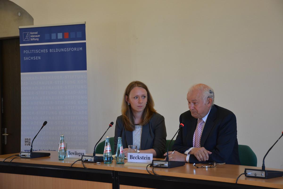 Zu Beginn seines Vortrags hob Dr. Günther Beckstein hervor, dass die Frage nach dem Zusammenhang von Gewissen, Politik und Recht ihn schon einen Großteil seines Lebens begleitet. Durch Martin Luther sei der Mensch mehr in den Mittelpunkt des Glaubens gerückt. Seine Aussage „hier stehe ich und kann nicht anderes“ zeige exemplarisch, dass er dem einzelnen Individuum mit seinen Gewissensentscheidungen mehr Gewicht gab. Dieser Gedanke finde sich auch in Artikel 4 des Grundgesetzes wieder, so Beckstein. Die Religions-, Glaubens- und Gewissensfreiheit gelten ohne Gesetzesvorbehalt. In einem kurzen Exkurs zu seinem Dissertationsthema „Gewissenstäter im Strafrecht und Strafprozeßrecht“ merkte Beckstein andererseits aber auch an, dass man sich nicht wegen seines Gewissens über das bestehende Recht hinwegsetzen darf.