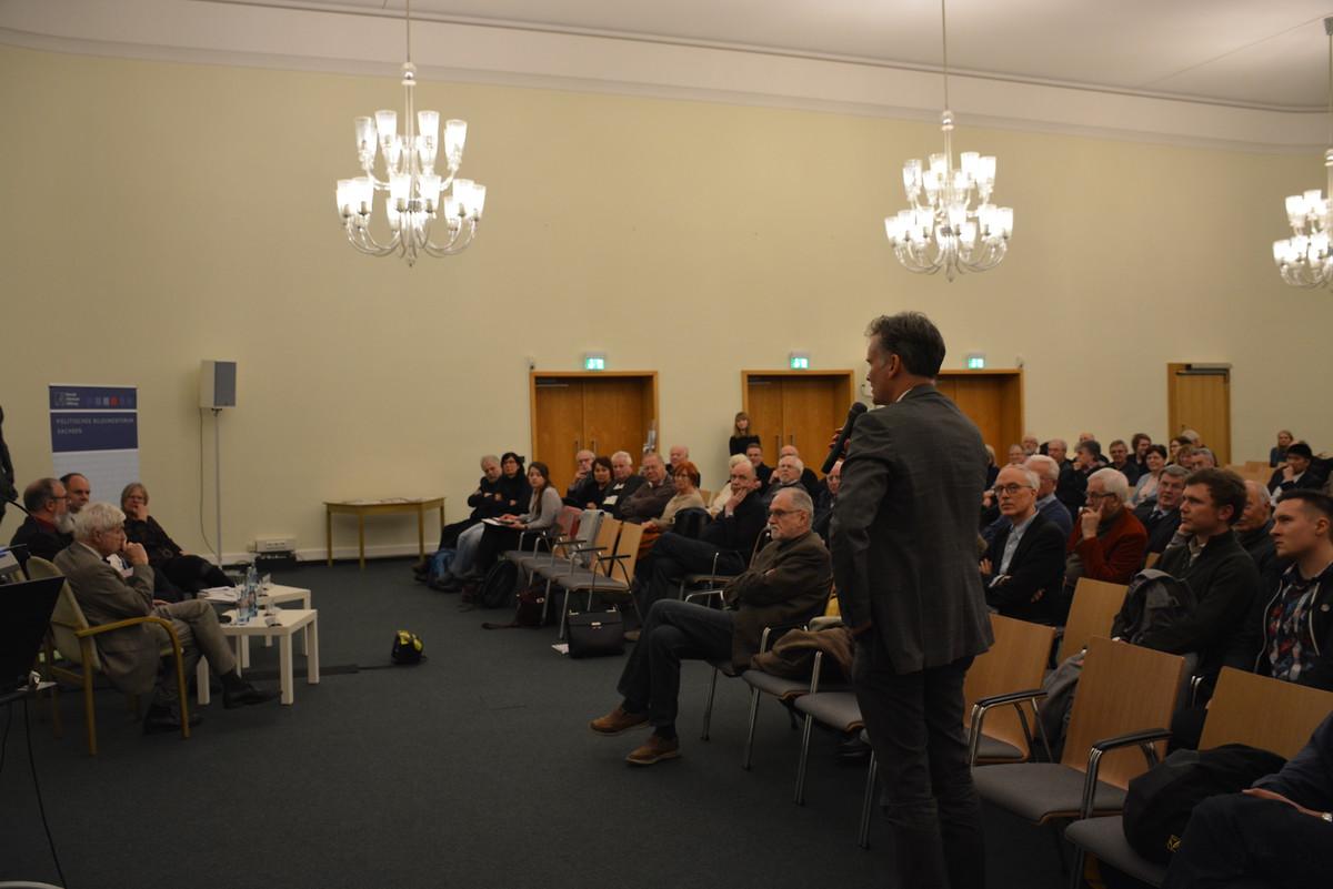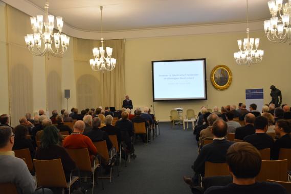 Im letzten Teil der Veranstaltung fand eine anregende Diskussions- und Fragerunde der Podiumsgäste und der rund 100 Besucher statt. Unter anderem wurde die Frage gestellt, wie ein Denkmal zum Denkmal wird. Ist es die künstlerische Inszenierung, die sich geplant mit der Vergangenheit auseinandersetzt? Oder sind es eher jene Orte und Plätze, die aufgrund ihrer geschichtlichen Verortung zu Denkmälern werden? Eines ist dabei sicher, resümierten Dr. Kaminsky und Prof. Stürmer, Denkmäler brauchen den Gebrauch. Denkmalpflege umfasse nicht allein die Pflege, sondern vor allem den aktiven Besuch. Nur so werde eine Erinnerungskultur geschaffen und aufrechterhalten.