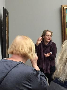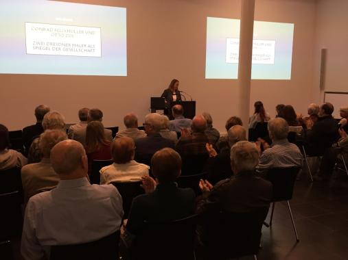 Im Anschluss an die Führung referierte Anke Dietrich, Doktorandin an der TU Dresden zu dem Thema „Conrad Felixmüller und Otto Dix – Zwei Maler als Spiegel der Gesellschaft“. Dabei beleuchtete sie anhand der Biographien der beiden Maler den Übergang von Expressionismus zur Neuen Sachlichkeit und die Entstehung der Dresdner Sezession 1919. Anschaulich erläuterte sie, wie der Mensch als gesellschaftliches Wesen den Mittelpunkt der künstlerischen Werke bildete und wie die die Dresdner Sezession 1919 die Kunst- und Kulturszene Dresdens beeinflusste.