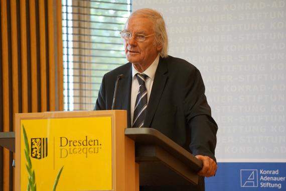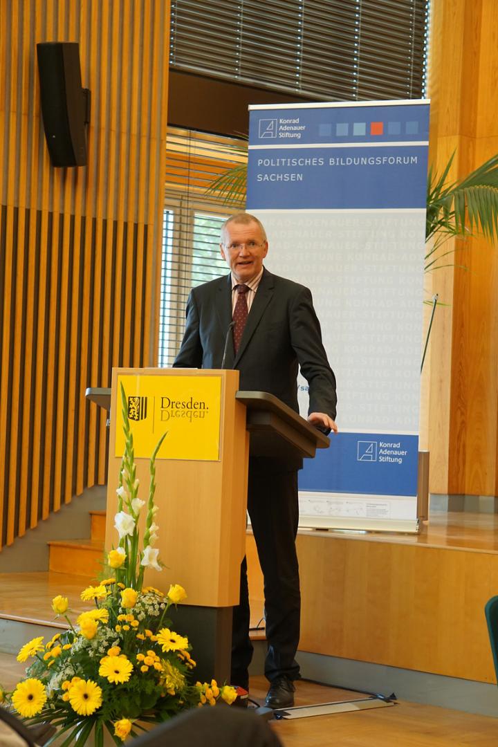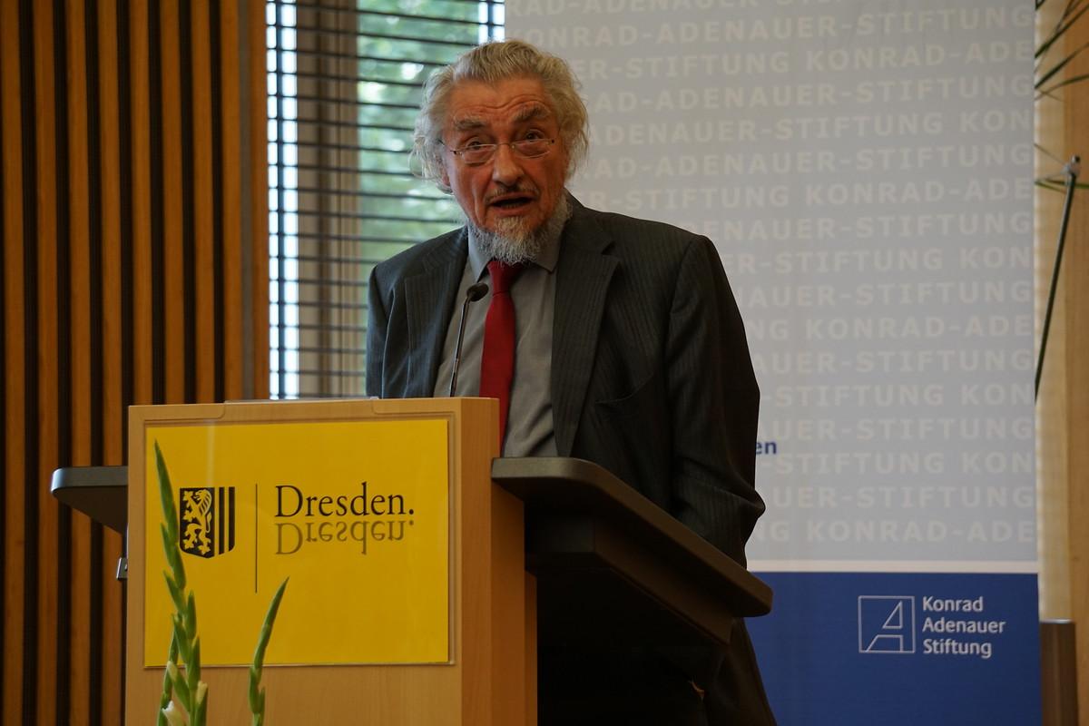 Nach dem Grußwort führte Dr. Joachim Klose, der Leiter des Politischen Bildungsforums Sachsen der Konrad-Adenauer-Stiftung in die Thematik ein und stellte die Referenten vor. Zunächst sprach Dr. Erhardt Neubert, um die Perspektive auf 1953 und 1968 aus ostdeutscher Sicht zu erläutern. Dabei hob er hervor, dass trotz der Niederschlagung des Aufstands die Geschichte von Opposition, Widerstand und Flucht ununterbrochen bis 1989 weiterging. Im Weiteren beschrieb Neubert auch die Rezeptionsgeschichte des 17. Juni. So hätten viele Schriftsteller und Politiker wie Stefan Heym und Willy Brandt zeitgenössische Interpretationen über den Aufstand verfasst. Im Laufe der Jahre habe dieser jedoch eine Abwertung erfahren. Erst Helmut Kohl führte 1982 im Bundestag wieder die Erinnerung an den 17. Juni ein. Zum Abschluss schilderte der Referent noch einige seiner persönlichen Erfahrungen aus dem Jahr 1968 und erläuterte, welche Auswirkungen der Prager Frühling auf die Gesellschaft in der DDR hatte.