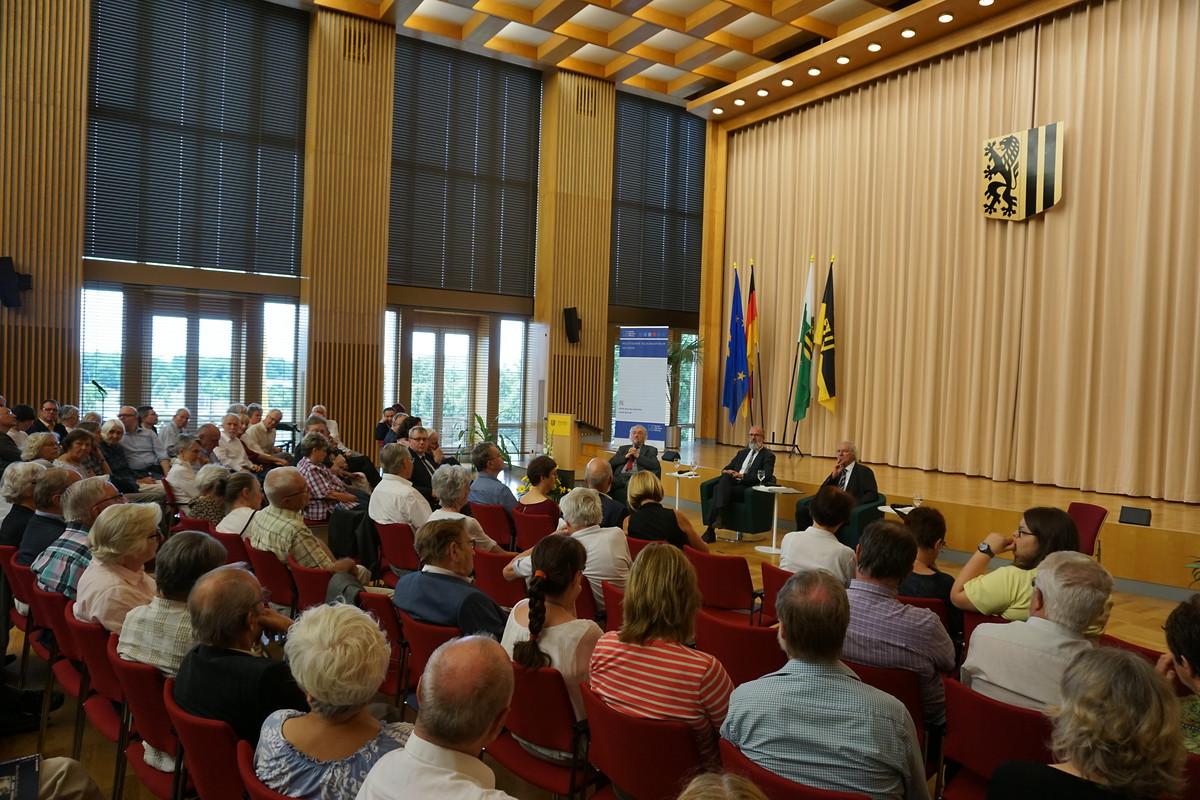 In einer abschließenden Diskussionsrunde hatte das Publikum die Möglichkeit, Fragen zu stellen und Anmerkungen zu äußeren. So wurde beispielsweise danach gefragt, wie die „Blutspur des Terrorismus“ verarbeitet wurde. Prof. Dr. Karl-Siegbert Rehberg, ein Dresdner Soziologe, der im Publikum saß, veranschaulichte die Bedeutung des 17. Juni mit einer starken Metapher: