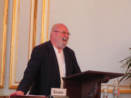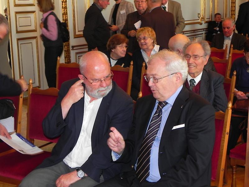 Im Anschluss referierten Pfarrer Nikolaus Krause aus Dresden und Prof. Dr. Franz Häuser, Altrektor der Universität Leipzig, über das Thema „Paulinerkirche“. Pfarrer Krause schilderte, wie er die Sprengung der Paulinerkirche im Jahre 1968 miterleben musste und plädierte dafür, das Gebäude nach seinem Wideraufbau, der in der nächsten Zeit abgeschlossen sein wird, ausschließlich für sakrale Zwecke zu nutzen. Prof. Dr. Franz Häuser suchte Verständnis für die Position der Universität Leipzig zu gewinnen, für welche die universitäre Nutzung als Aula im Vordergrund steht. Die heftigen verbalen Auseinandersetzungen, die in den letzten Jahren über diese Frage in der Öffentlichkeit ausgetragen wurden, bezeichneten beide Referenten als unnötig.