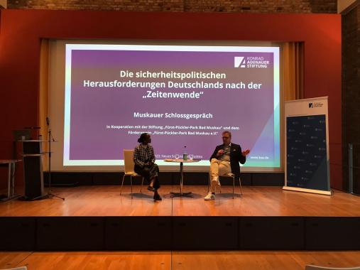Nach dem Mittagessen setzten wir unsere Veranstaltung im atemberaubenden Ambiente des historischen Neuen Schlosses in Bad Muskau fort. Hier sprach Dr. Markus Kaim über die sicherheitspolitischen Herausforderungen Deutschlands nach der „Zeitenwende“. Nach dem Beginn des Ukraine-Kriegs wird in Deutschland intensiv über eine grundlegende Neuausrichtung der Sicherheits- und Verteidigungspolitik diskutiert. Die vielfältigen Herausforderungen, mit denen Deutschland konfrontiert ist, reichen von der Gewährleistung der Energiesicherheit über die Pflege enger transatlantischer und europäischer Beziehungen bis hin zur effektiven Bekämpfung des Terrorismus. In diesem Zusammenhang wurden wichtige Fragen erörtert, wie Deutschland effektiv zur internationalen Stabilität beitragen kann und welche Verantwortung es als eine der führenden Volkswirtschaften Europas trägt. Das Publikum beteiligte sich lebhaft an der Diskussion und erkundigte sich detailliert nach bestimmten Herausforderungen, wodurch ein umfassender Einblick in die aktuellen sicherheitspolitischen Dynamiken Deutschlands gewonnen werden konnte.
